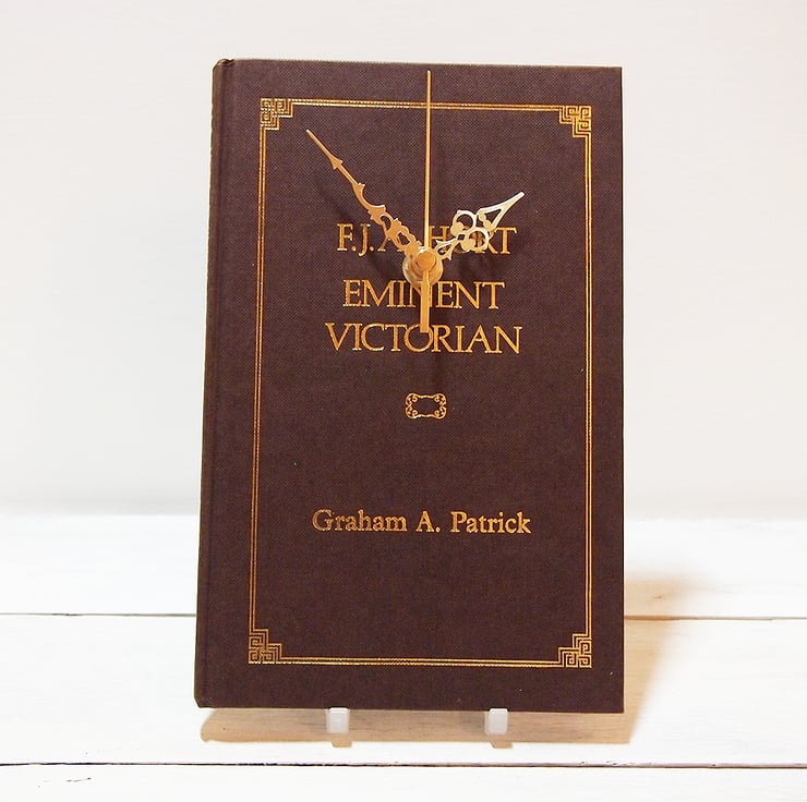This book clock is made by repurposing a hardback copy of F J A Hort Eminent Victorian from 1987.