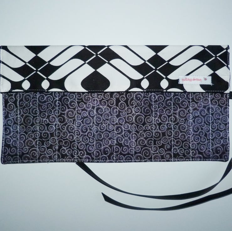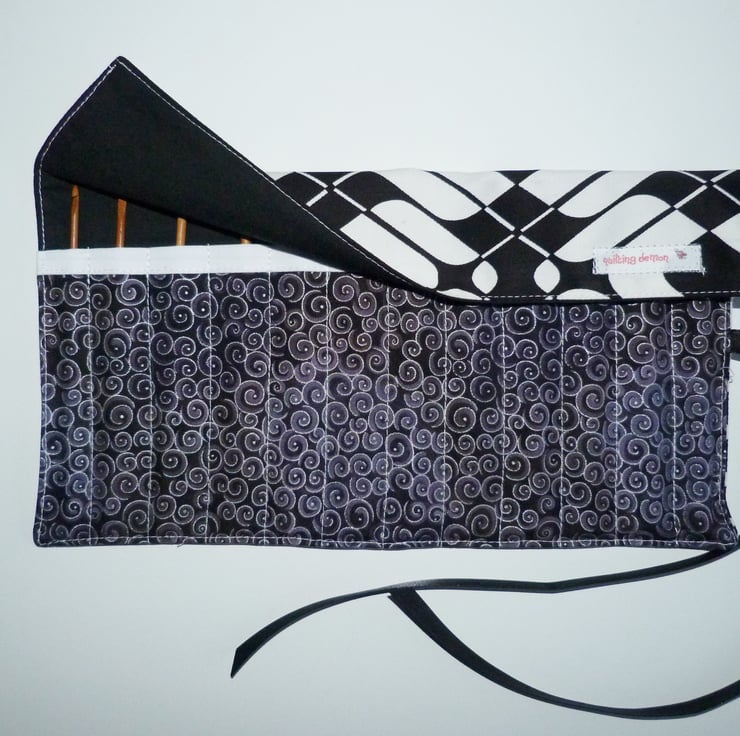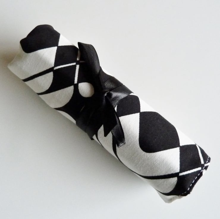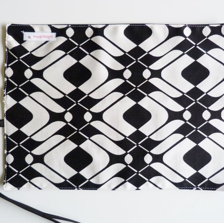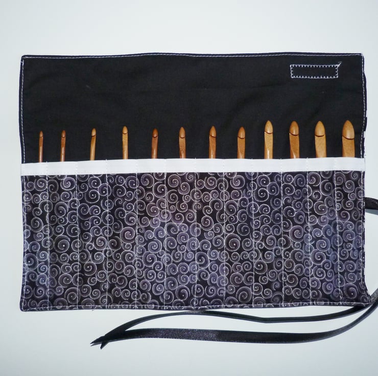 I have used a 100% cotton fabric to create this fantastic crochet hook case. It is sewn from a black and white print fabric with a co-ordinated cotton lining and has a black ribbon tie.