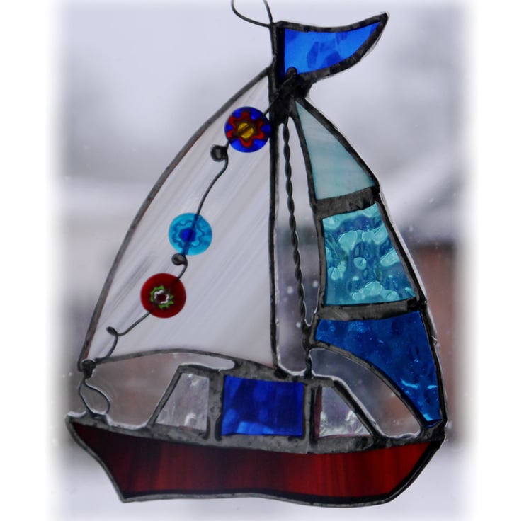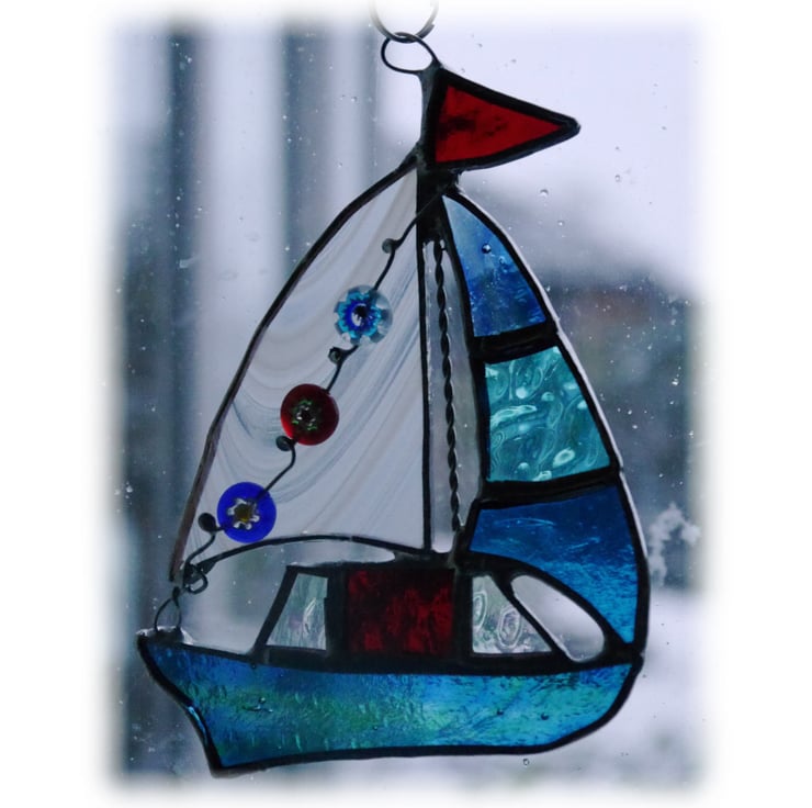 It has a little blue flag and a bllue cabin which has an iridescent raindrop textured window, a bright turquoise sail which includes some very shiny iridescent glass and a striped white sail which is decorated with 3 little flower beads, as flags, in bright colours to match the boat.