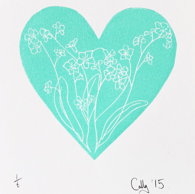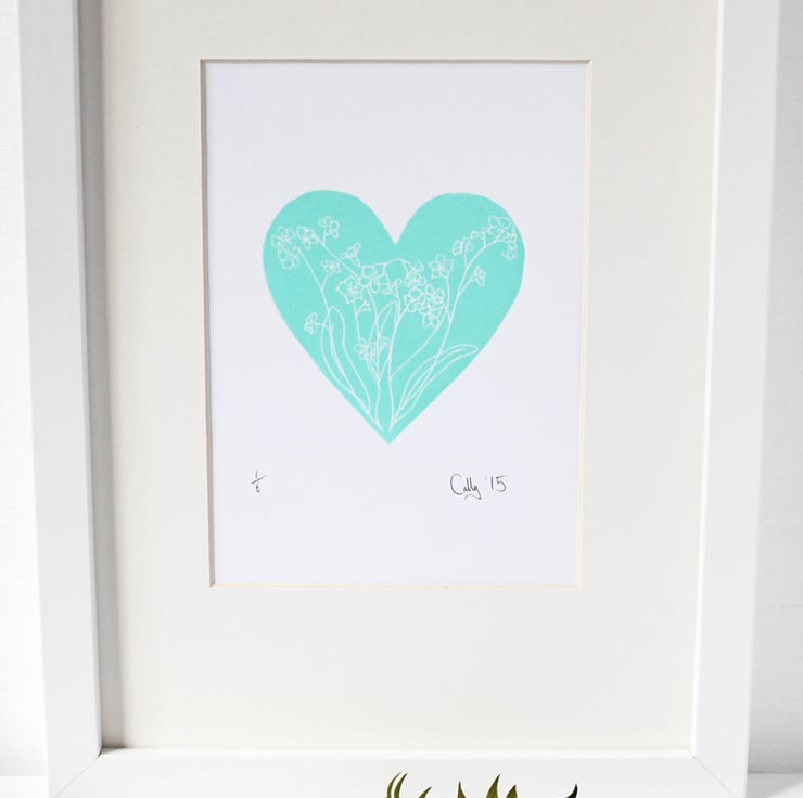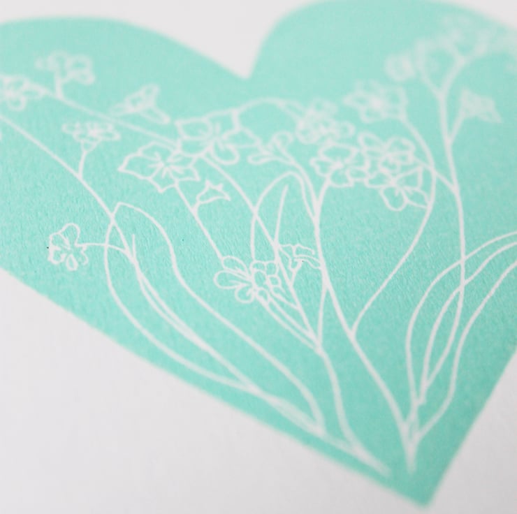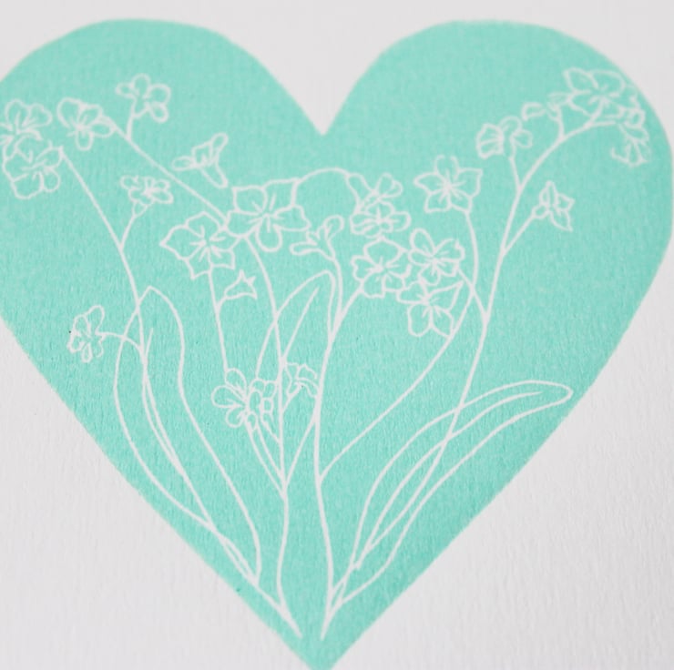 A limited edition handmade lino cut heart print. Depicting forget-me-not flowers encased in a calm mint green heart shape. An edition of 6 printed in this colour.