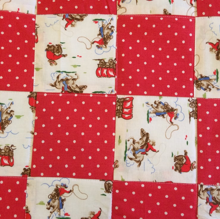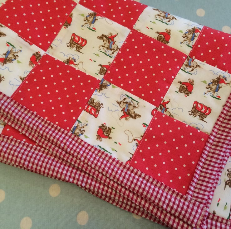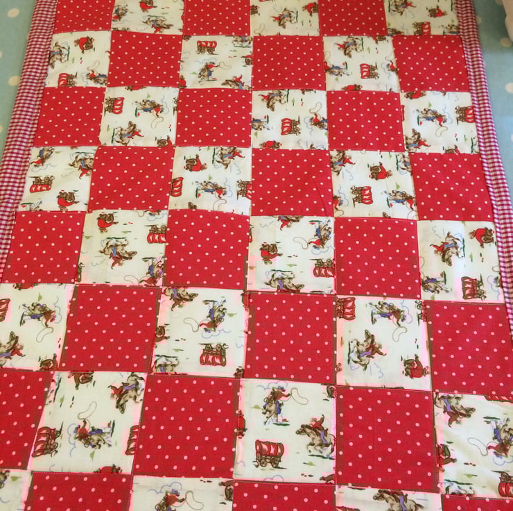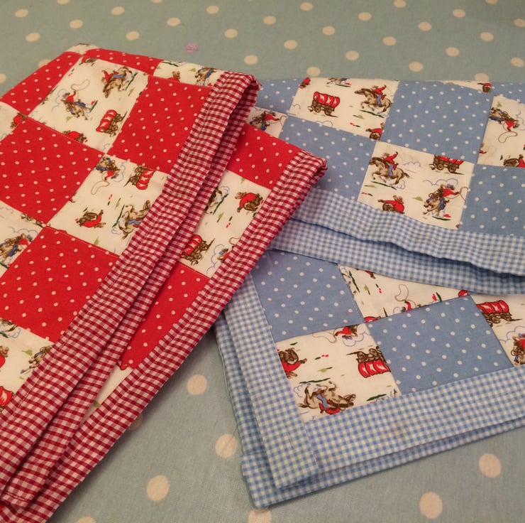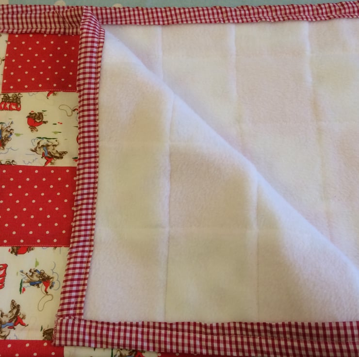 Gorgeous patchwork quilt ideal for a pram , cot or car seat , it measures 29" x 19" and has a white fleece back , it can be machine washed on cool and line dried , as it is handmade and patchwork it will not stand a huge amount of wear and tear and washing and it is lightweight