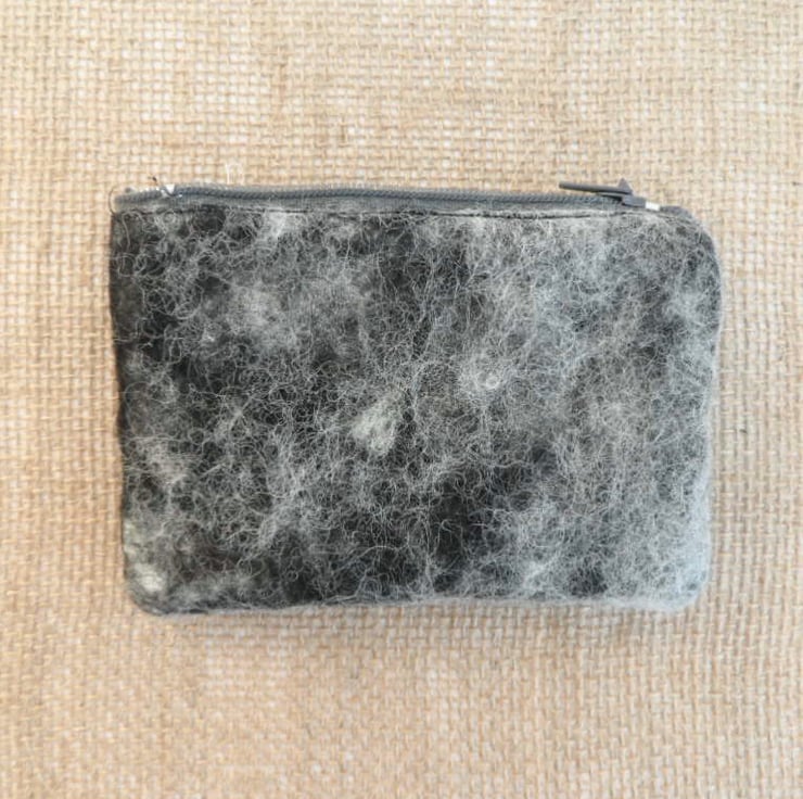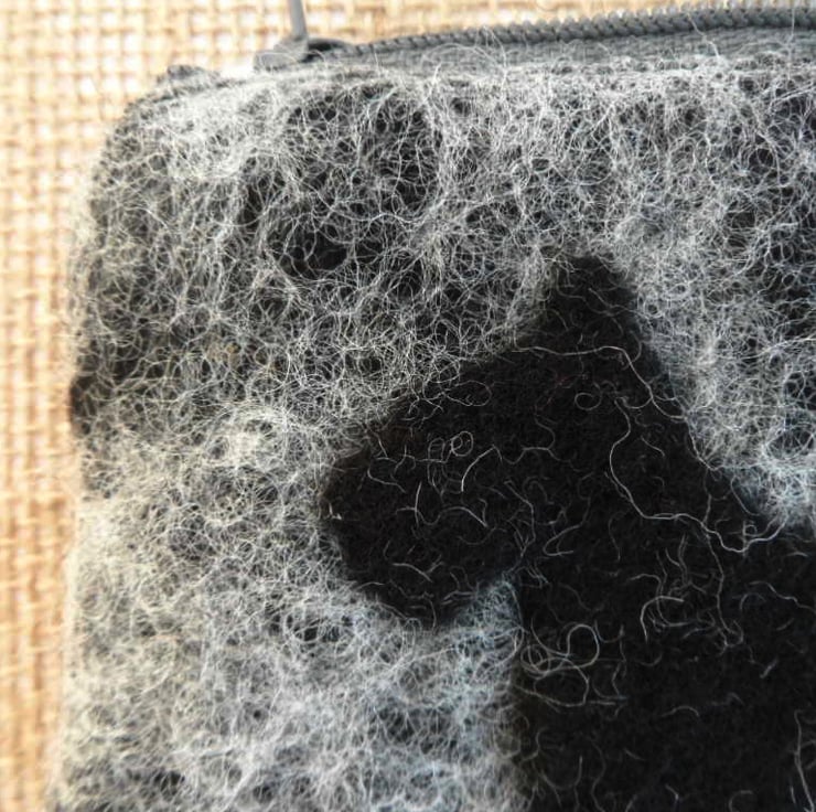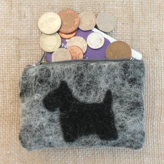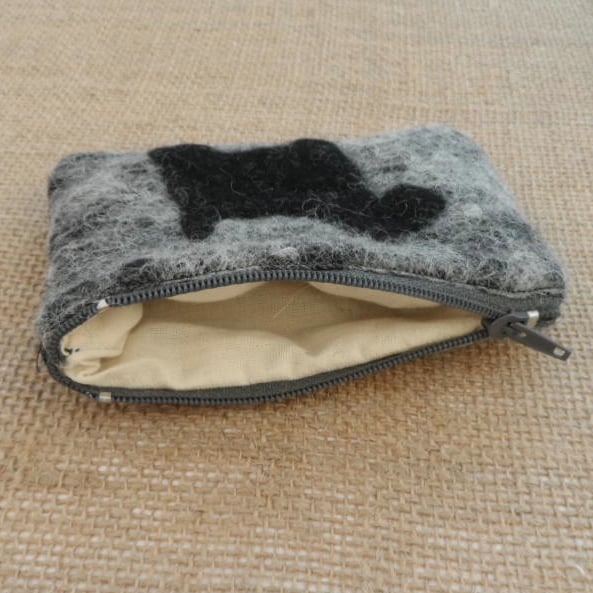 A delightful little coin purse. Grey Jacob wool has been nuno felted onto a cotton muslin base with a little scottie dog silhouette applied to the surface. The resulting felt fabric has been stitched into a zipped coin purse lined with cream cotton calico fabric. The purse measures approximately 12cm x 8cm and is large enough to hold credit cards comfortably.