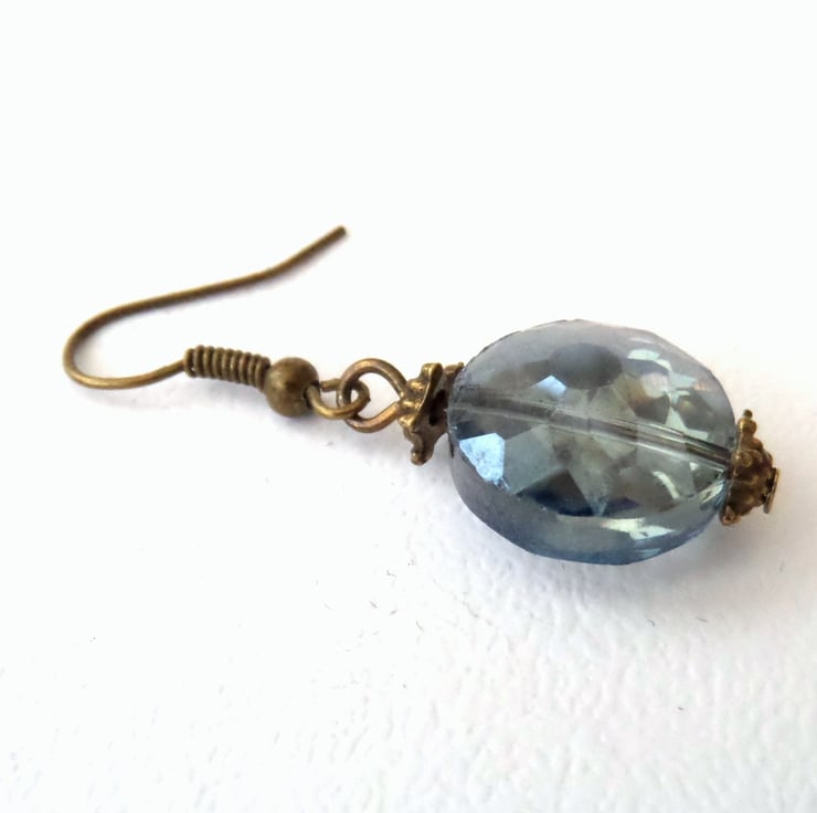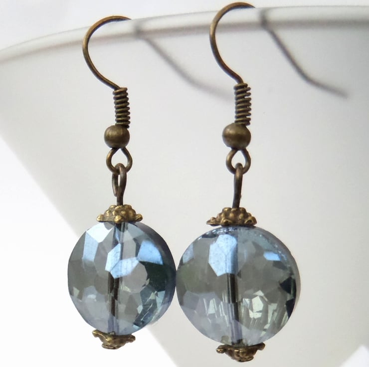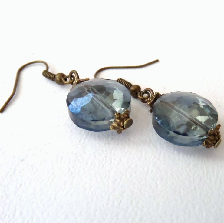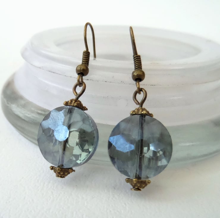 A stunning pair of smoking blue crystal earrings, featuring a faceted coin shaped crystal.