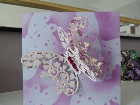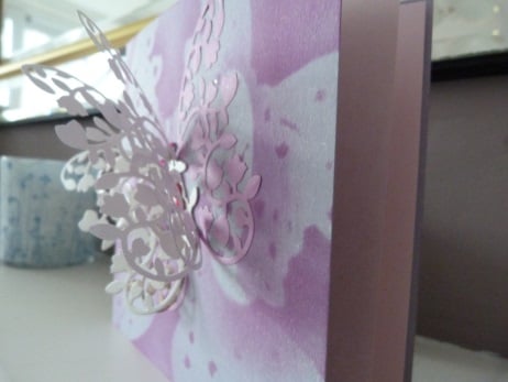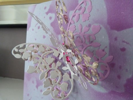 A beautiful butterfly die cut from ivory pearl card, with two extra layers die cut from rose vintage card and deep pink card, to give a lovely 3d effect. Mounted onto grey/white flecked card which has the image of a butterfuly hand inked in deep pink. The body is emphasised with deep pink rhinestones and also the ends of the antennae.