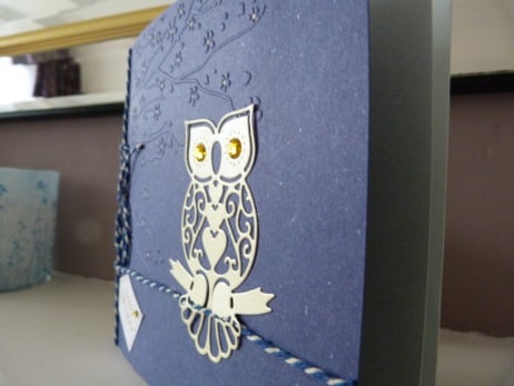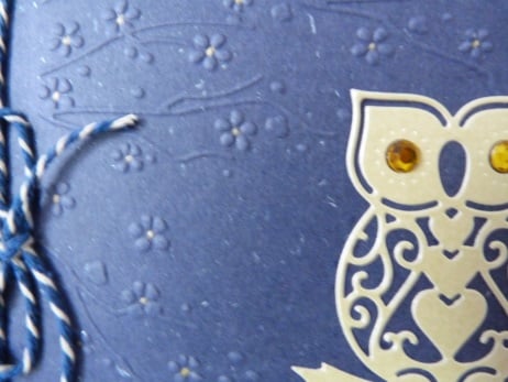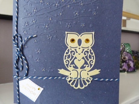 A very pretty owl die cut from pale gold pearl card which has been mounted onto navy/white flecked card. This card has a branch of flowers embossed onto it and the centres of the flowers have been hand coloured in gold ink. The owl has gold rhinestone eyes and is sitting on navy/white twisted butchers twine. A navy/white butchers twine and bow decorates the left edge of the card. Finished off with a happy birthday tag.