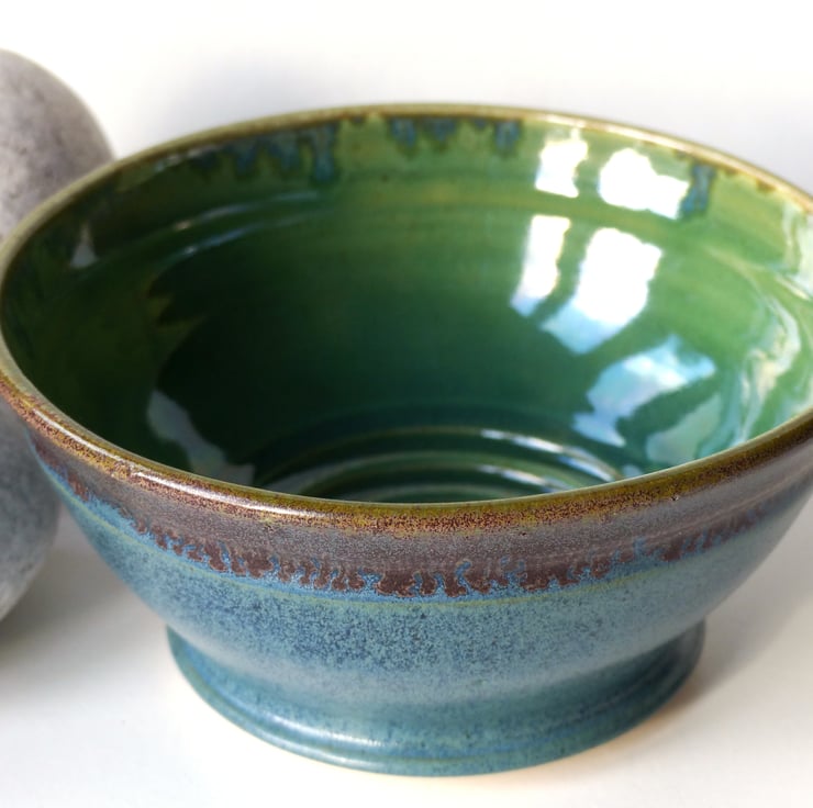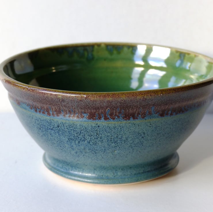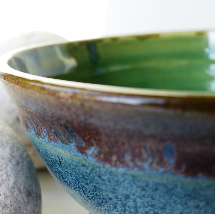 The colours in this bowl include on the inside a rich mixture of fresh greens and browns, the rim an olive green, and the outide rich blues and greens.