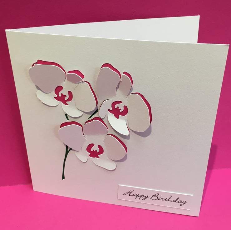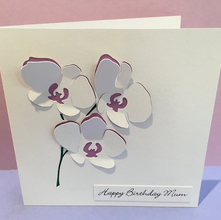 This beautiful mother's day card has been made by carefully hand cutting the centre of three orchid and its' large petals and delicately folding them out of the card. Simple and stunning for a special Mum on Mother's Day.