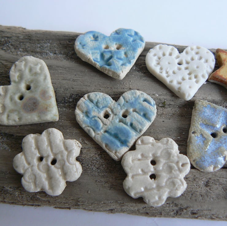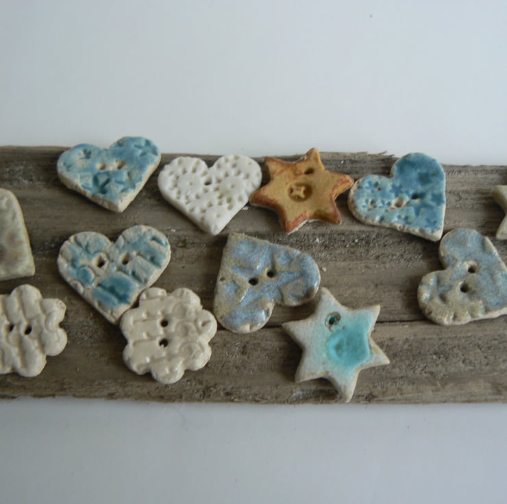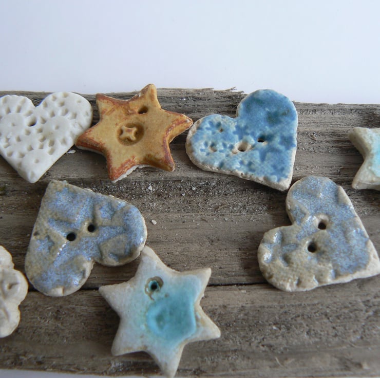 A mixed bag! Small stoneware and porcelain buttons and hangings for a variety of craft projects from knitting and felting to card making and appliqué adornment - what ever takes your fancy...