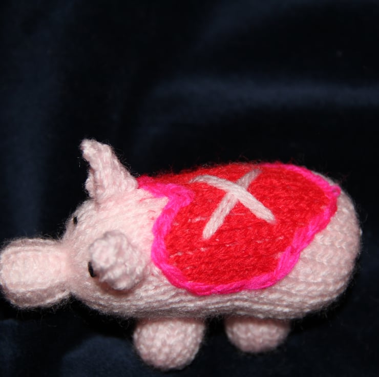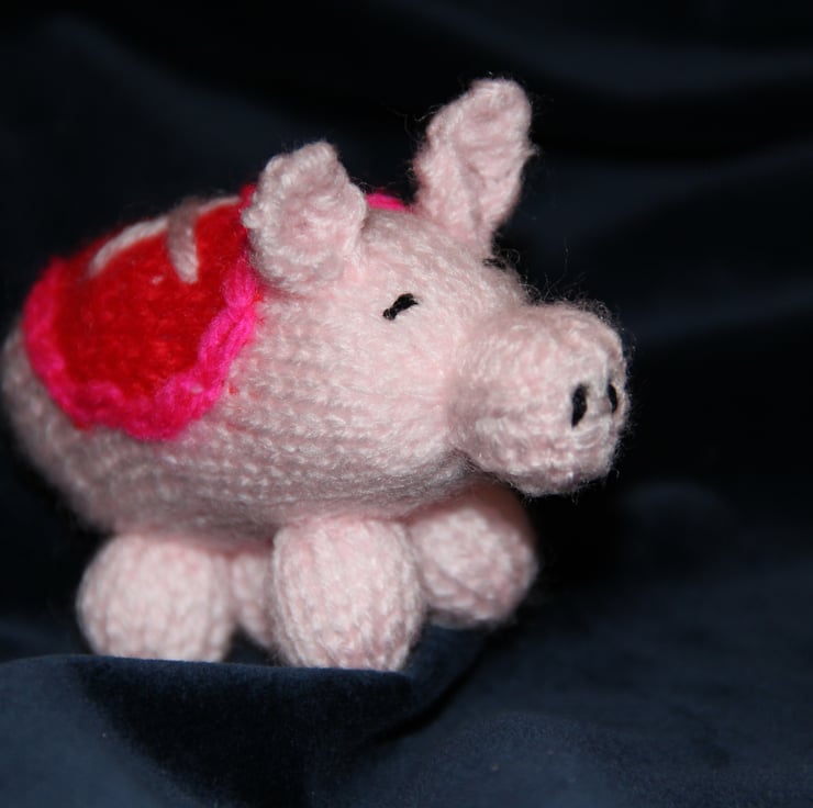 More fat little valentine pigs to the sty! Big Kiss Piggy is hand knitted from my original design. He stands 6 cm tall and is 10cm from snout to wiggly tail. This piggy has no sharp or loose parts, everything is stitched so it can be given to young children (as long as they don't pull his tail too hard!!). Because each one is knitted individually, your piglet will be unique.