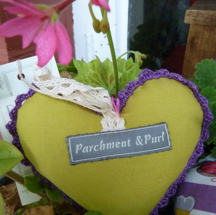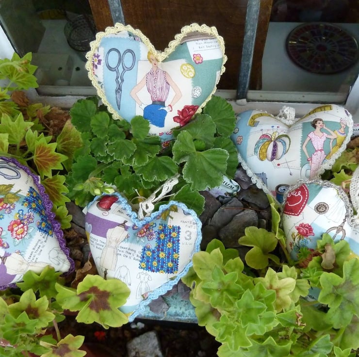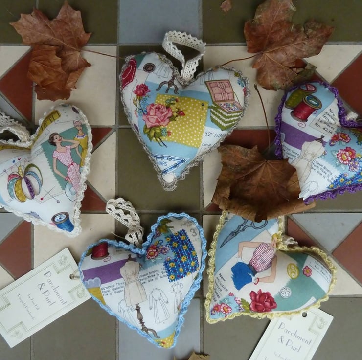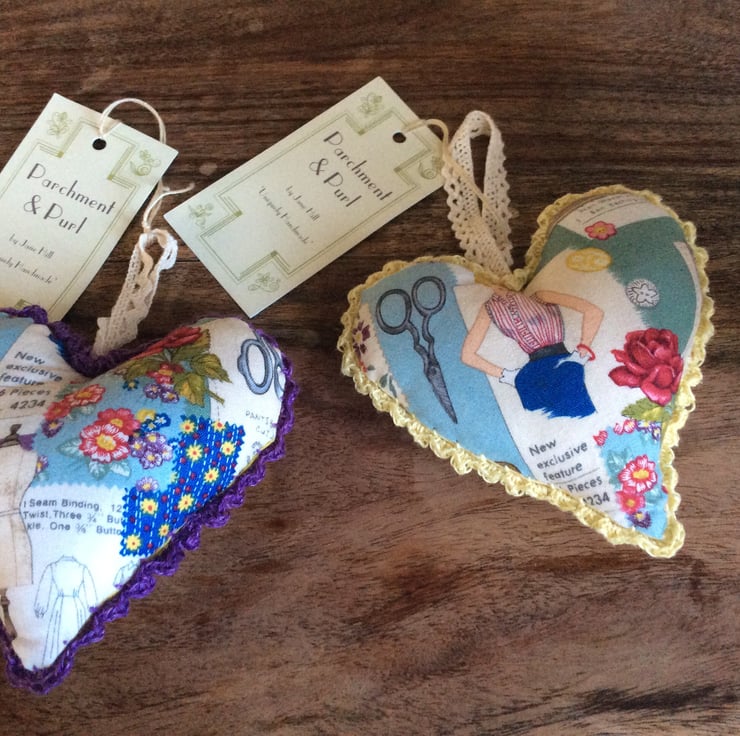 Handmade pincushion in a retro style sewing design fabric. Edged with a hand crocheted trim in linen yarn and finished with a lace hanging loop.