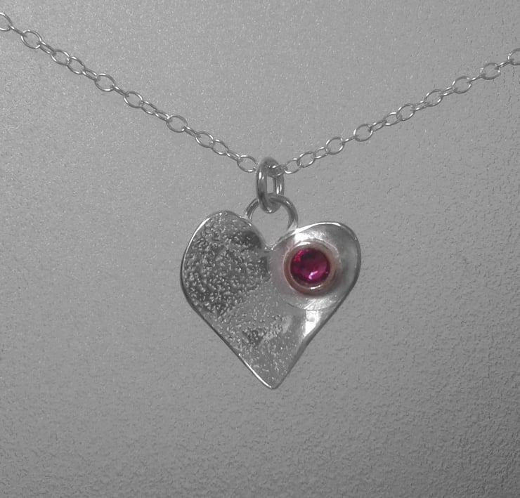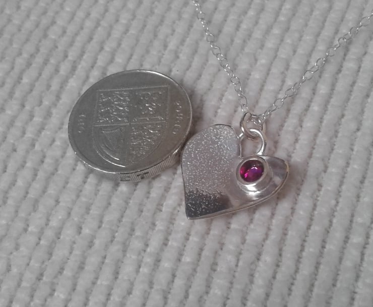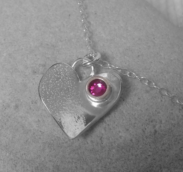 This pretty pendant is the perfect gift for the one you love. The heart shape has been pierced from 1mm sterling silver sheet, domed and given a sandy texture on one side to make it sparkle and shine. I have added a 4mm Swarovski crystal in fuchsia pink, set in a silver tube. The pendant measures 2.1x2.0cm and weighs 2.2g. It has an integral bail and is attached by means of a jump ring to a 45cm (18inch) sterling silver trace chain. I can supply other chain lengths on request.
