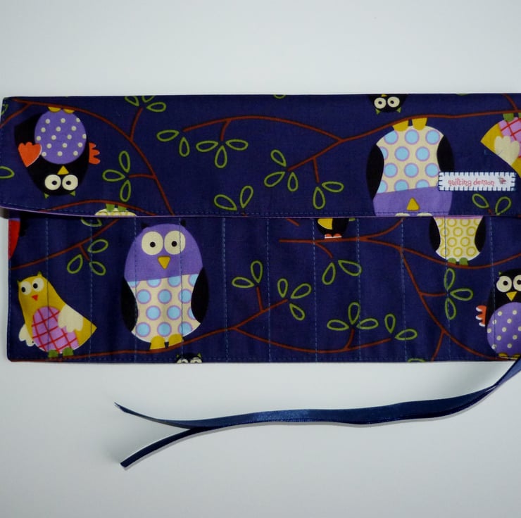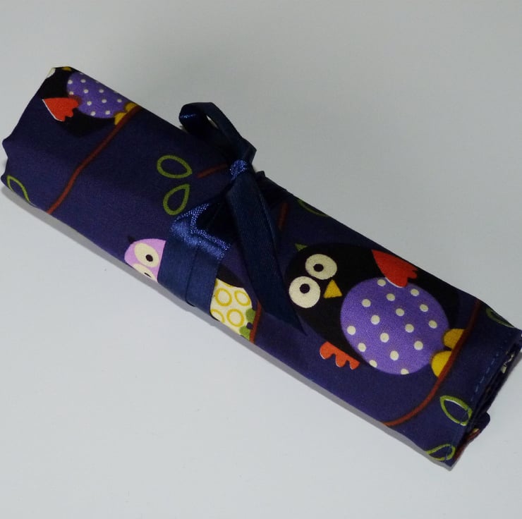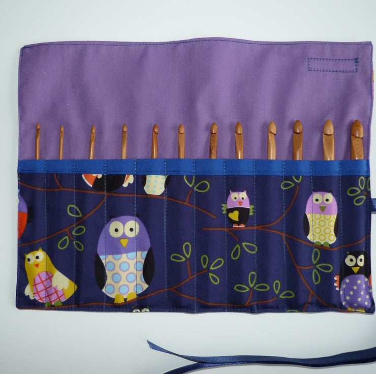 I have used a 100% cotton fabric to create this fantastic crochet hook case. It is sewn from a lovely owls print fabric with a plain purple cotton lining and has a blue ribbon tie.