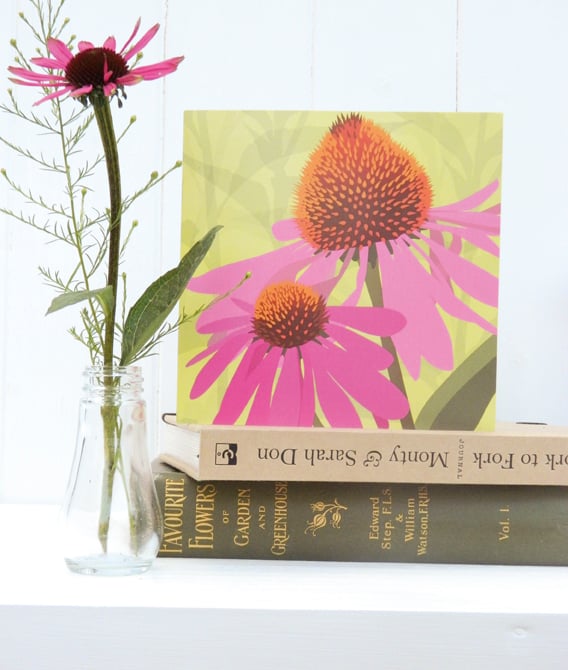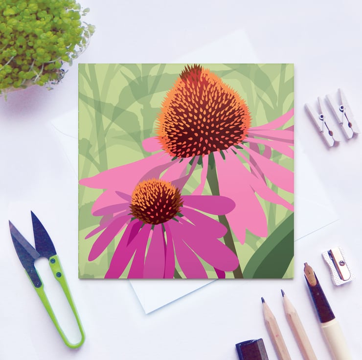 A pretty pink floral blank birthday card featuring the echinacea, or coneflower. A burst of late summer colour in the garden! Perfect for gardeners or anyone who loves pink!