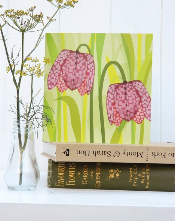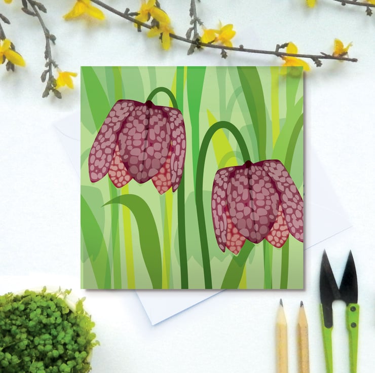 Such a special little woodland flower - this pretty little Purple Fritillaria, also known as a Snakeshead Frittilary, is quiet rare and difficult to grow. Makes a perfect floral birthday card for anyone who loves woodland walks or flowers!