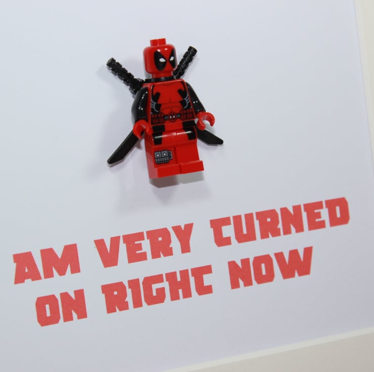 This little minifigure of Deadpool has been mounted inside a deep box frame and the quote "I am very turned on right now" printed underneath. It would make a great gift for any comic book fan.