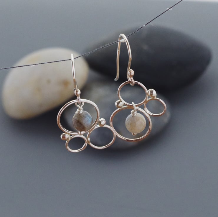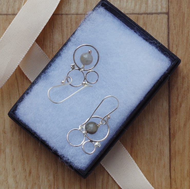 My on-trend filigree earrings are inspired by bubbles. They are asymmetrical with the 6 mm Labradorite beads set at different places in the filigree to make them look more "bubbly." Labradorite is a semi-precious gemstone that is a dove grey colour but has flashes of green, blue and violet deep within the stone. The Inuit people of Canada believe that these colours are the Northern Lights, trapped forever in the stone. They are a very wearable size, at just 37 mm 1.5" long including the ear-wire, and would compliment any style or colour of clothing. They were made using lots of sterling silver hoops in different sizes and thicknesses of wire, hand-made and soldered together by me. I handmade ear-wires and headpins for the drops from sterling silver in my West Sussex workshop in order to set these fabulous beads off.
