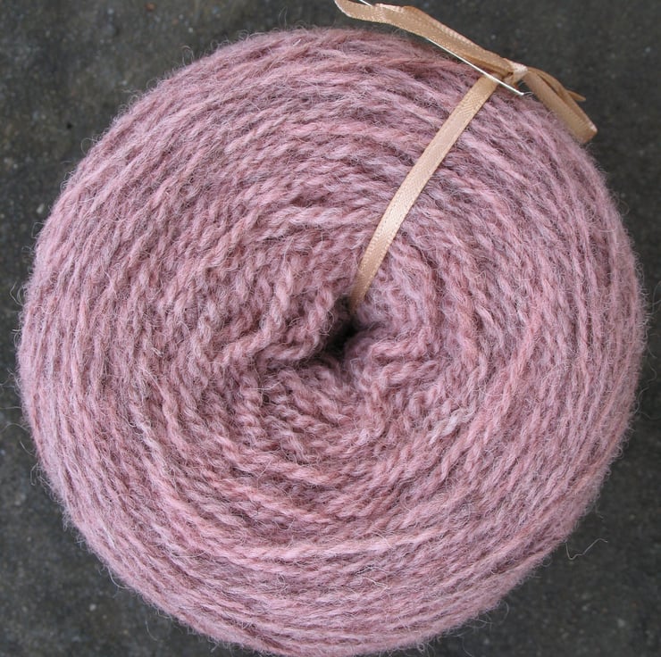 A blend of white and dark brown fleece in a 7 to 1 ratio overdyed Rose. 100g ball, approx 280 metres (300 yards). Hand wash separately at low temperature. A joy to knit and very warm. If you would like a free sample card of all the colours in this range, please send a stamped addressed envelope to Tavistock Tastes and Textures, Tor Grove Farm, Rix Hill, Tavistock PL19 9EQ.