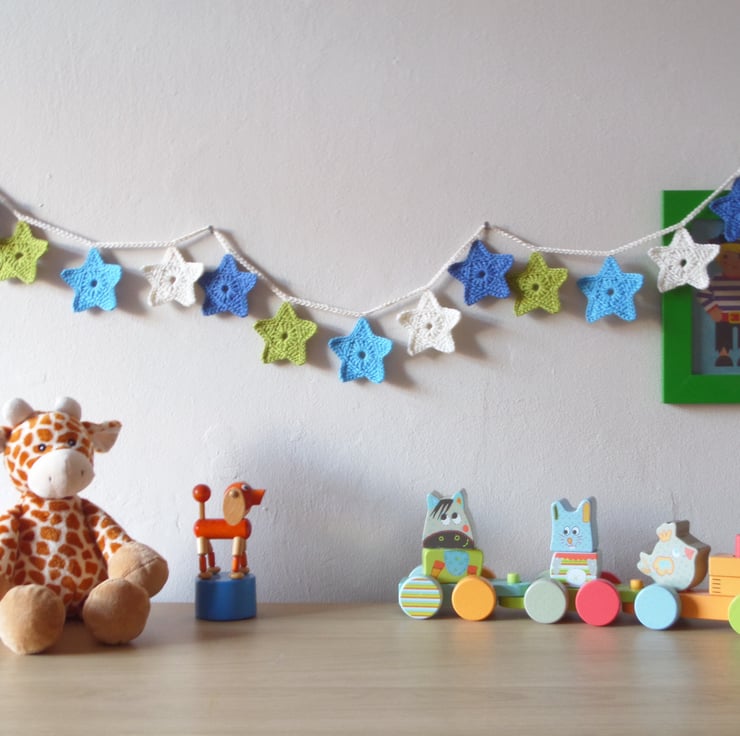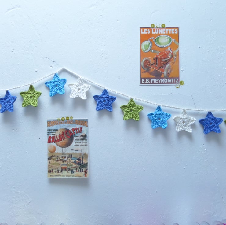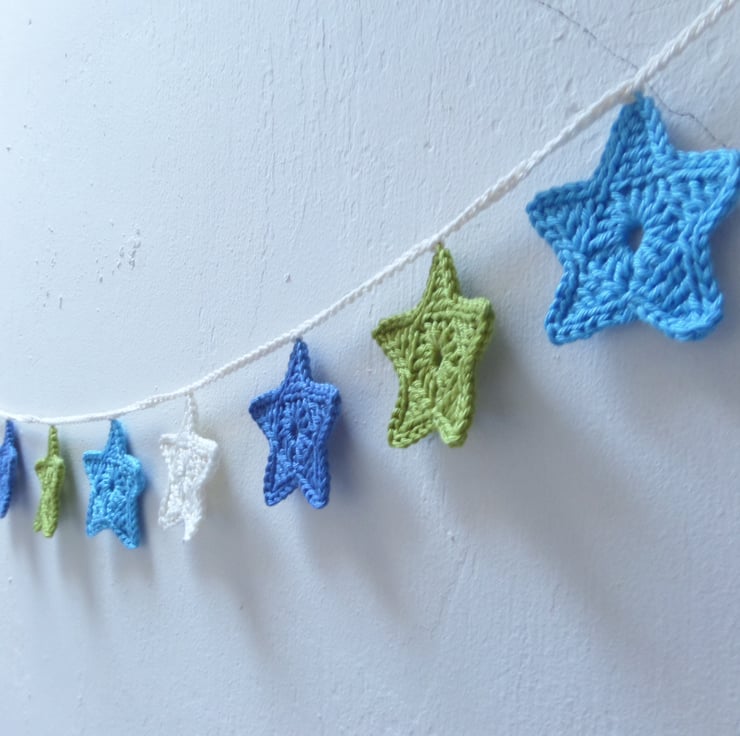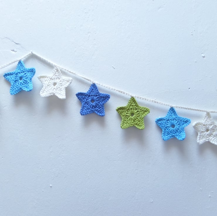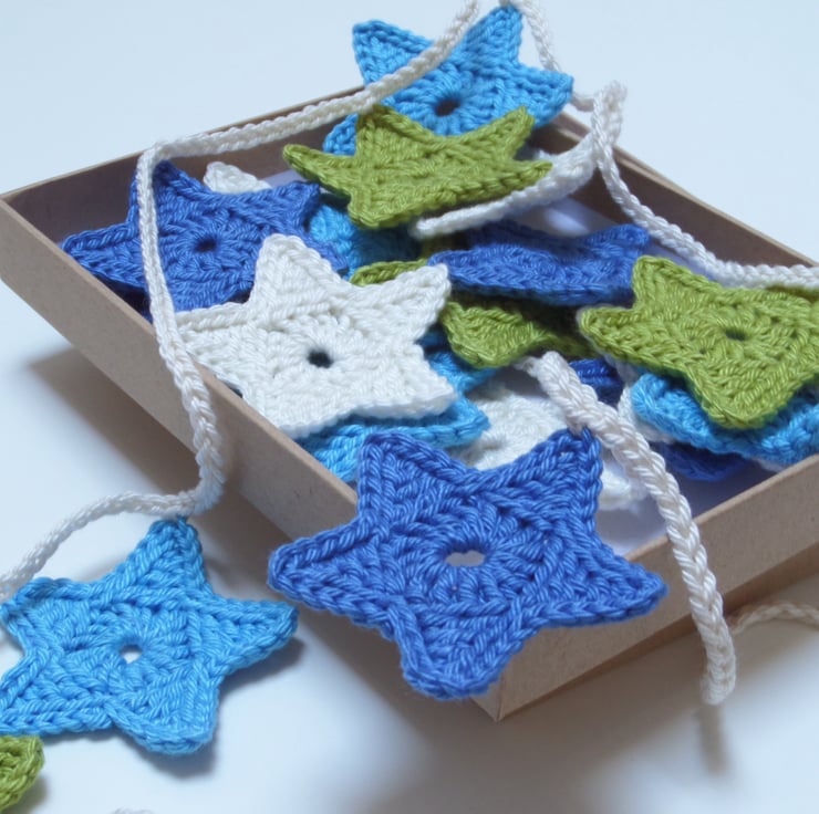 Each star is crocheted by hand from 100% Cotton, and measures 4.5cm across, and the full garland length is 185cm. A little loop at each end of the garland makes it simple to hang on the wall.