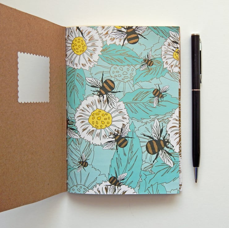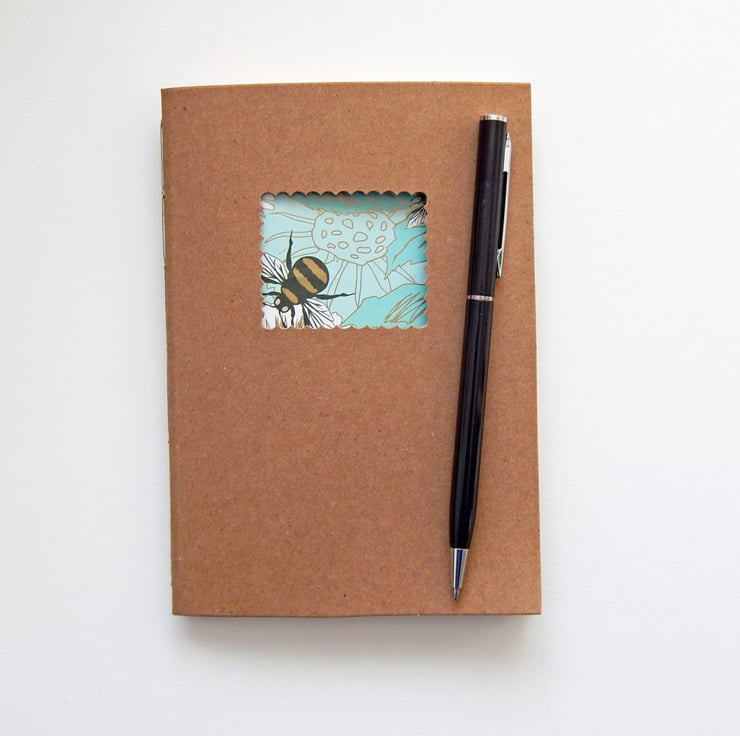 A handbound Moleskine-style notebook, with bees and daisy flowers framed by a cut-out in the front cover.