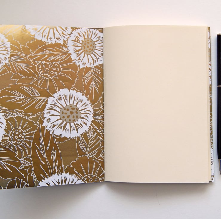 The endpapers are patterned in a double-sided floral design, with golden bees, white and golden daisies against an aqua blue background. A fat little bee can be seen through a die-cut scalloped rectangle cut from the kraft card front cover. The reverse of the endpapers show the daisy design in glossy gold and white.