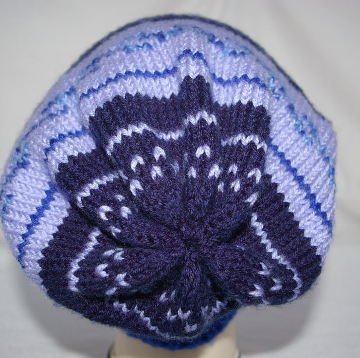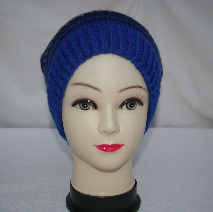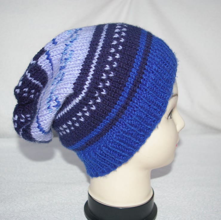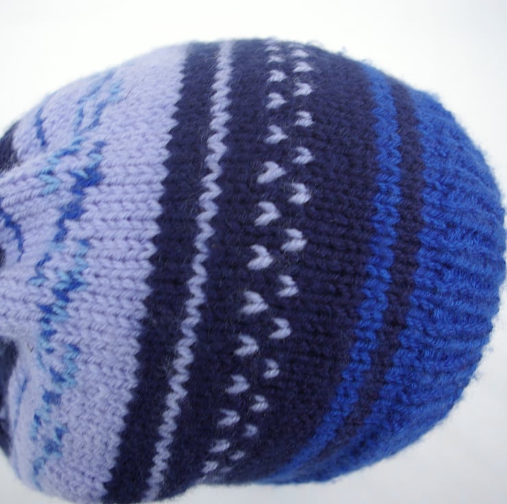 An extra warm hand knitted Slouch Beanie Hat in the Fair Isle Style. Four different shades of blue yarn have been used to create this Slouch Beanie Hat. The yarn used for this hat is a soft 100% acrylic yarn which is machine washable.