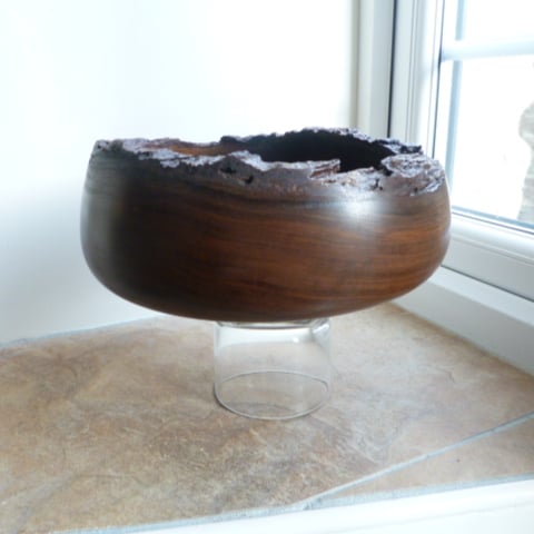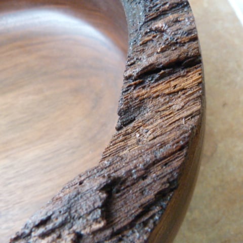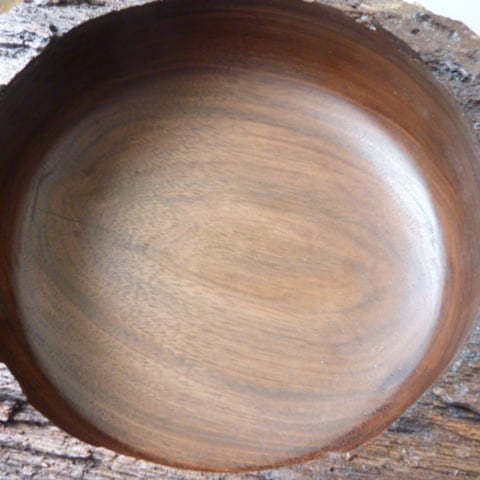 THIS IS FROM ONE PIECE OF WONDERFUL ENGLISH WALNUT. A CHUNKY BOWL WITH A WALL THICKNESS OF 1 INCH, THE TOP EDGE IS ACTUALLY THE REMAINS OF DECAYED BARK. IT HAS BEEN TREATED AND IS NOW SOLID AND VERY FIRM. THIS WITH THE COMPLETELY NATURAL COLOUR OF THIS PARTICULAR PIECE MAKES IT A VERY RUSTIC LOOKING ITEM. THE DIMENSIONS ARE 9 1/2 INCHES WIDE WITH A MAXIMUM HEIGHT OF 4 INCHES THE FINISH IS IN DANISH OIL