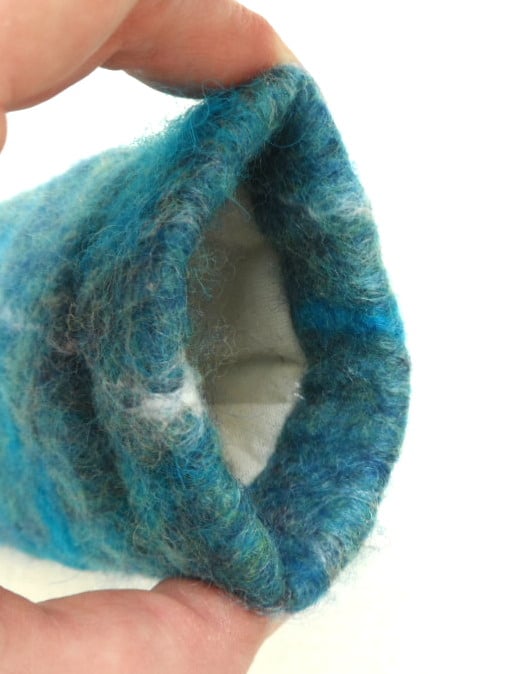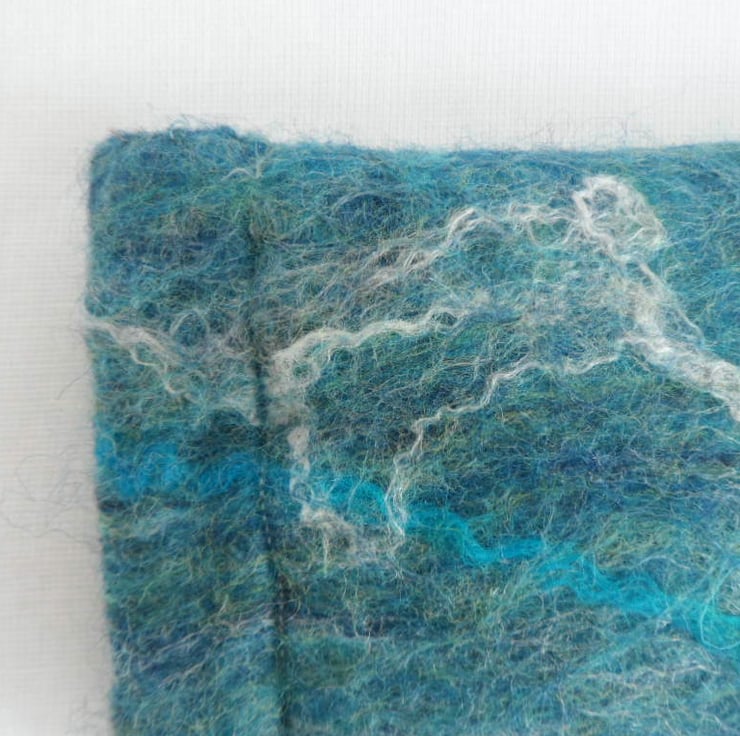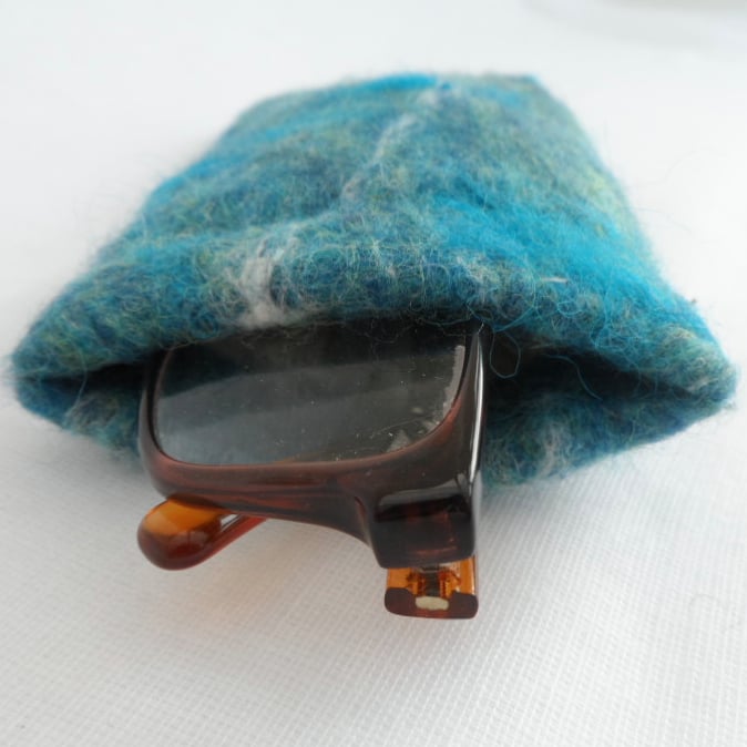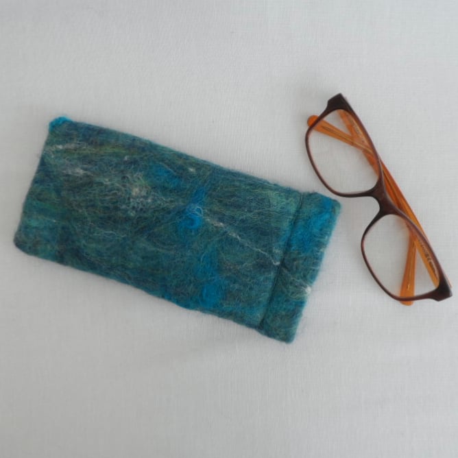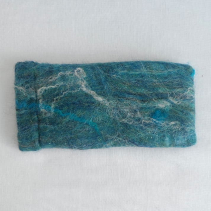 A beautiful piece of nuno felt, handmade from a blend of blue merino wool embellished with silk and wensleydale wool fibres nuno felted onto a cotton muslin base, has been used to make this glasses case. It has additional padding to protect the contents and is lined with cream cotton calico fabric. It has a flexiframe snap closure.