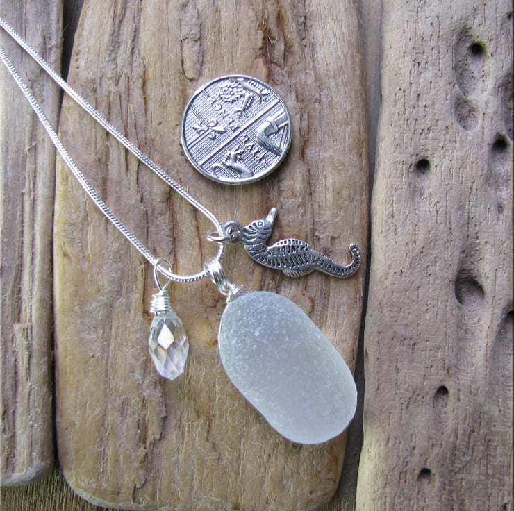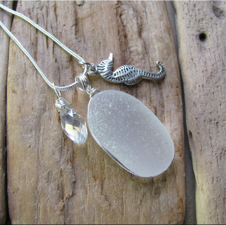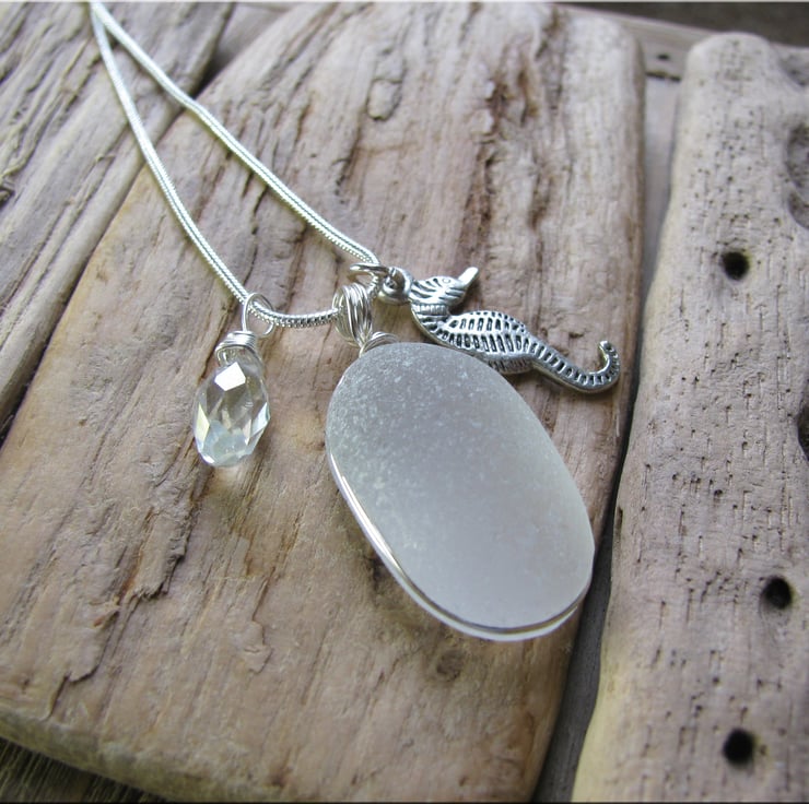 A perfectly smooth and frosted white piece of sea glass set in wire. The glass has been carved out around the edge and the wire sits in the groove to hold the glass in place. The wire is non tarnish, and is suspended from a silvertone snake chain. Complimented by a crystal drop and sea horse charm. Approx. 18"