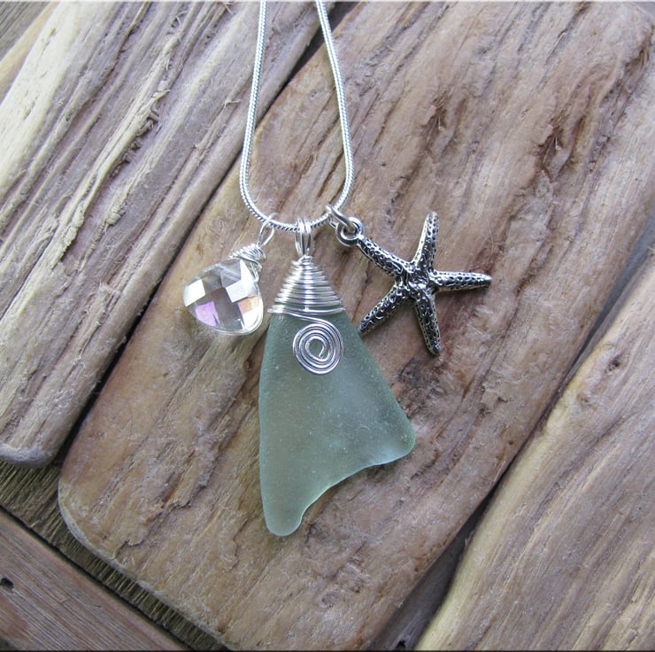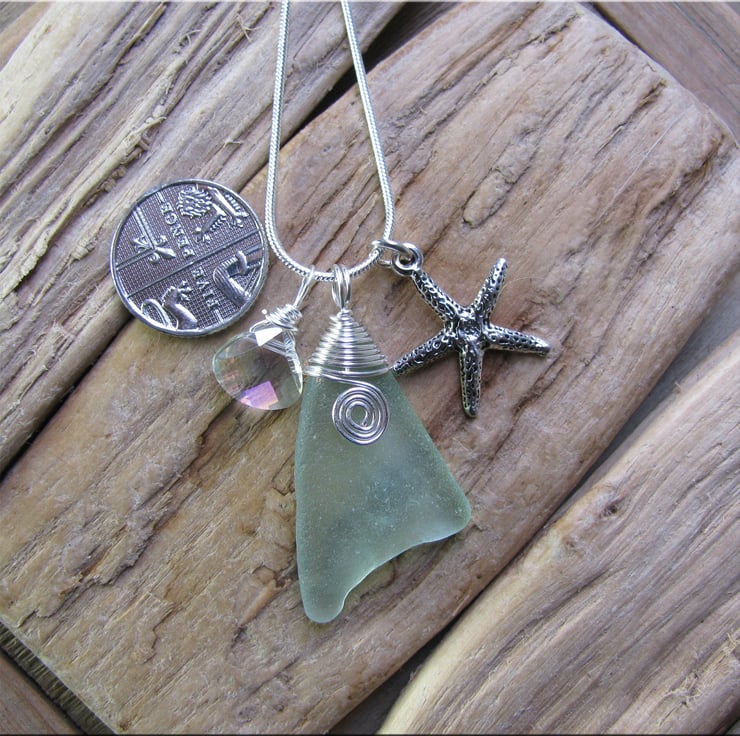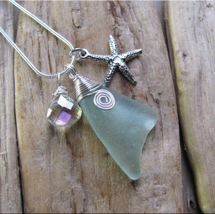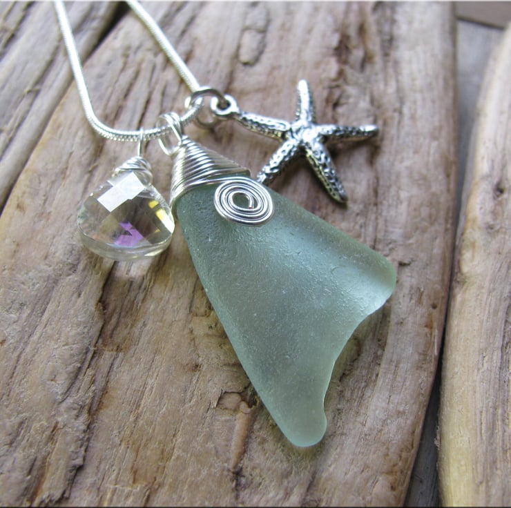 A lovely frosted natural piece of sea foam coloured sea glass with a wire wrapped bail and small scroll on the front. Complemented by a starfish charm and crystal drop . The wire is non tarnish, and is suspended from a silvertone snake chain. Approx. 18"