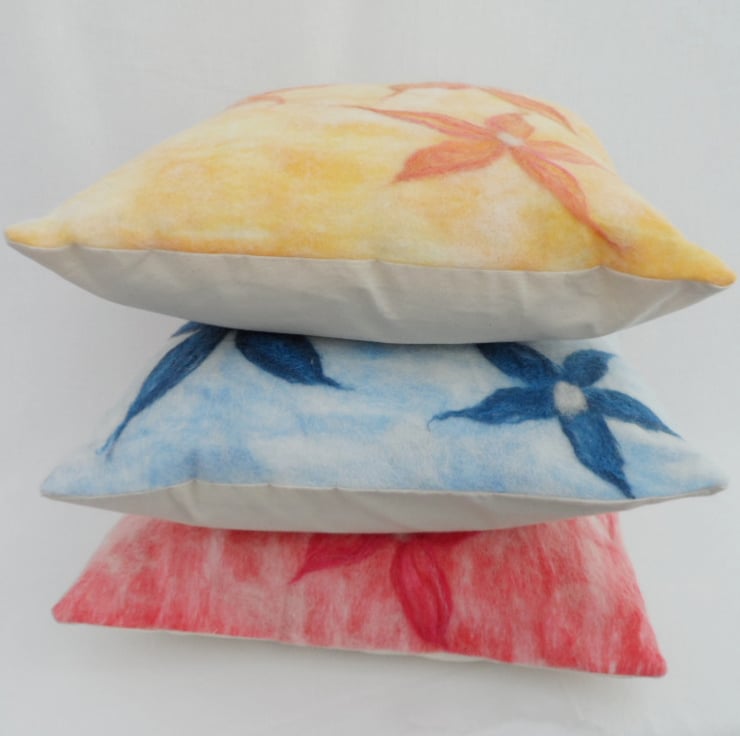Yellow shades of merino wool overlaid with a fine layer of white NZ perendale wool have been nuno felted onto a cotton muslin base fabric. Three large orange flowers have also been added using merino wool. It has been backed with fusible interfacing to give it strength and stability. The reverse side has been made using cream cotton calico with an envelope style closure.