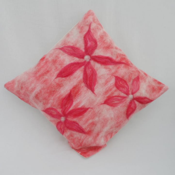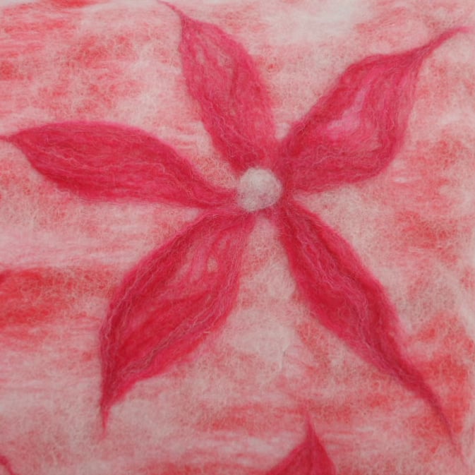 This gorgeous cushion cover has been made using red shades of merino wool overlaid with white NZ Perendale wool and nuno felted onto a cotton muslin base. Three large red flowers have been added using merino wool. It has been backed with fusible interfacing to give it strength and stability. The reverse side has been made using cream cotton calico with an envelope style closure.