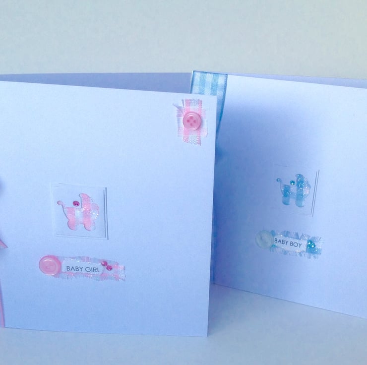 The design is made up of a square mount in the centre of the card,with a little pram shape,cut out, featuring crystals