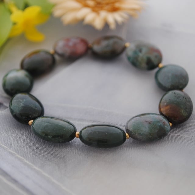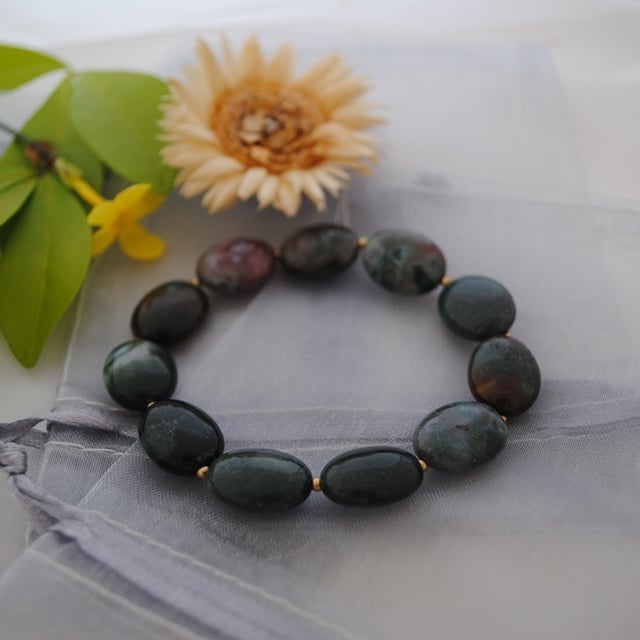 This stretch bracelet is made with beautiful oval Indian Agate beads with brass ball spacers. The beads are a mix of colours - but predominantly green and brown..
