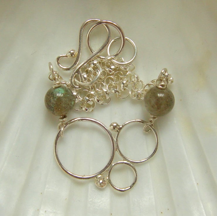 I imagined catching a bubble and turning it into silver. Of course it's impossible, but there are ways of making something that looks just right. Silver filigree is perfect for the task because it traces a fine outline through which the background can be seen and it is robust but not heavy. The Labradorite beads suggest the rainbows that form on the surface of a bubble before it bursts POP*