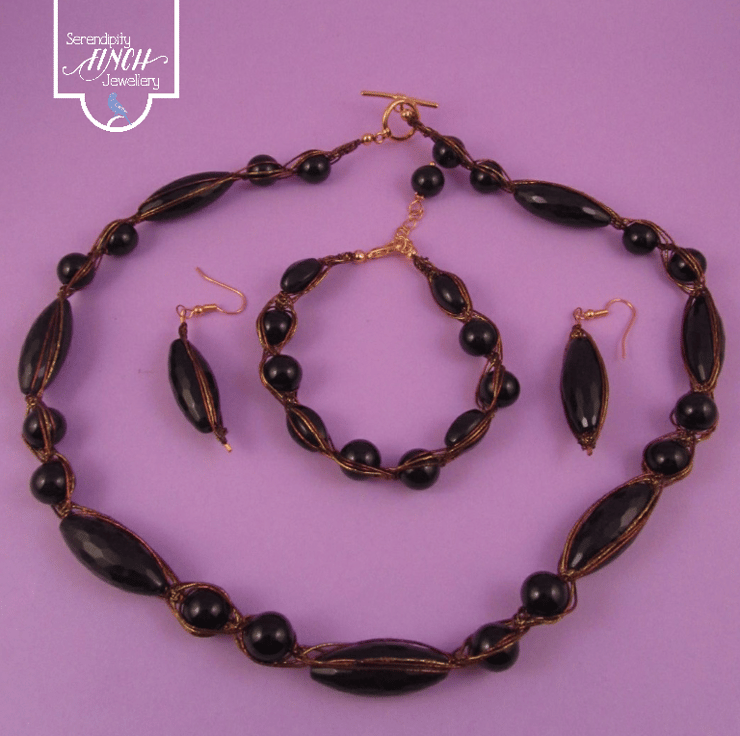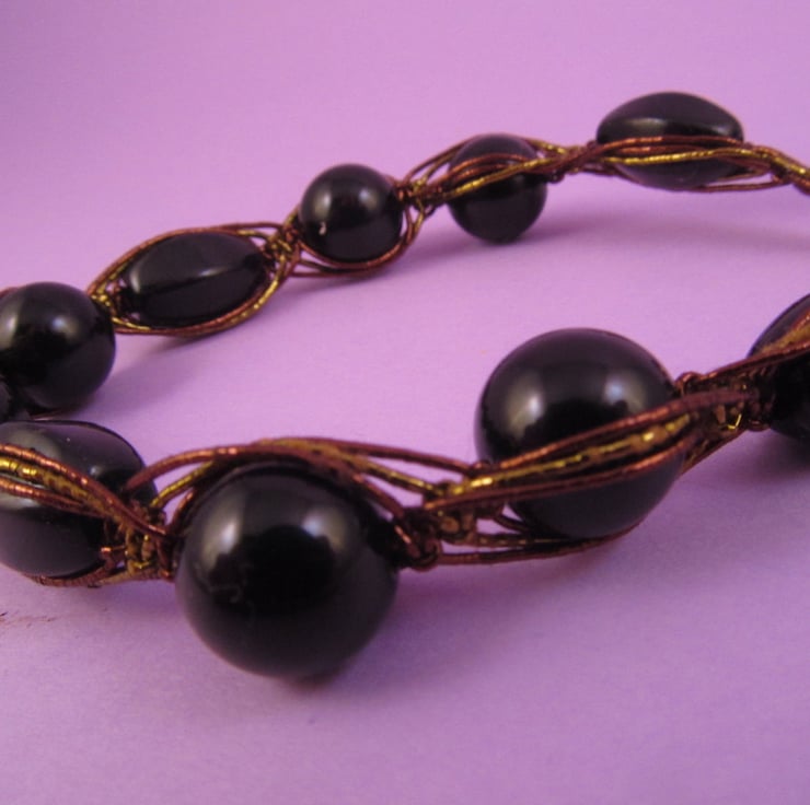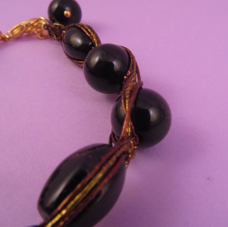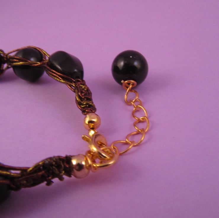These are stunning black agate with sari thread bracelet. It is created using 45 cts of real black agate gemstones, gold sari thread, bronze sari thread and gold plated e-coated copper. The facets of the agate are really shiny and catch the light. This is an elegant piece that would be great to wear on a night out.