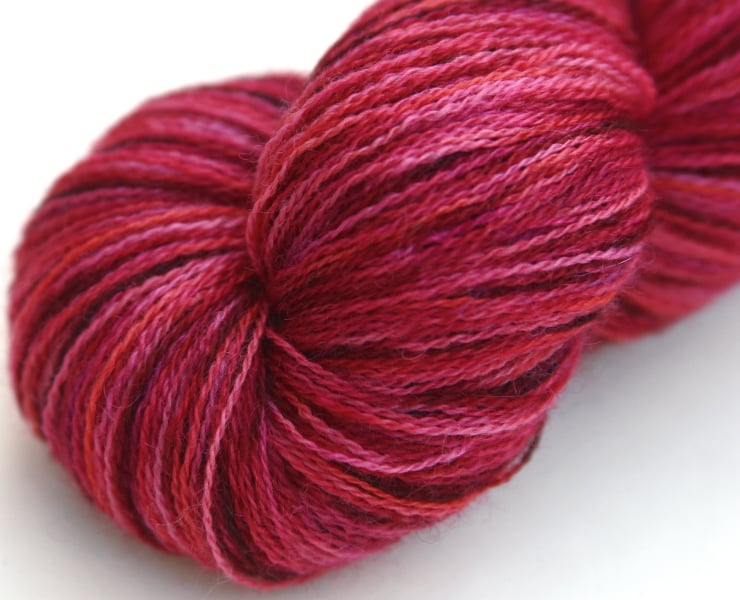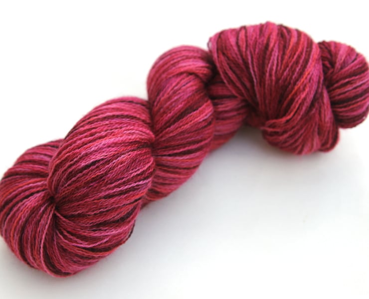 Shades of deep pinky-red with hints of maroon, dark orange and purple. This lustrous, lofty, soft yarn should make beautiful lace projects. Photographs have been taken and edited in bright but wintery natural light.