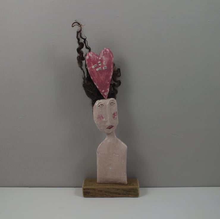 This doll is made from papier mache and has a card and paper armature, covered in vintage book paper. She has firstly been coated with white acrylic paint , then a skin colour - which has then been sanded back to reveal the white paint and print. The heart has had the same treatment with the addition of the words 'how do i love thee ' . Her hair is Wensleydale fleece glued to the back of her head ( and defies gravity ) ! She has had her features painted with acrylics and then she has been varnished and glued to a driftwood base.