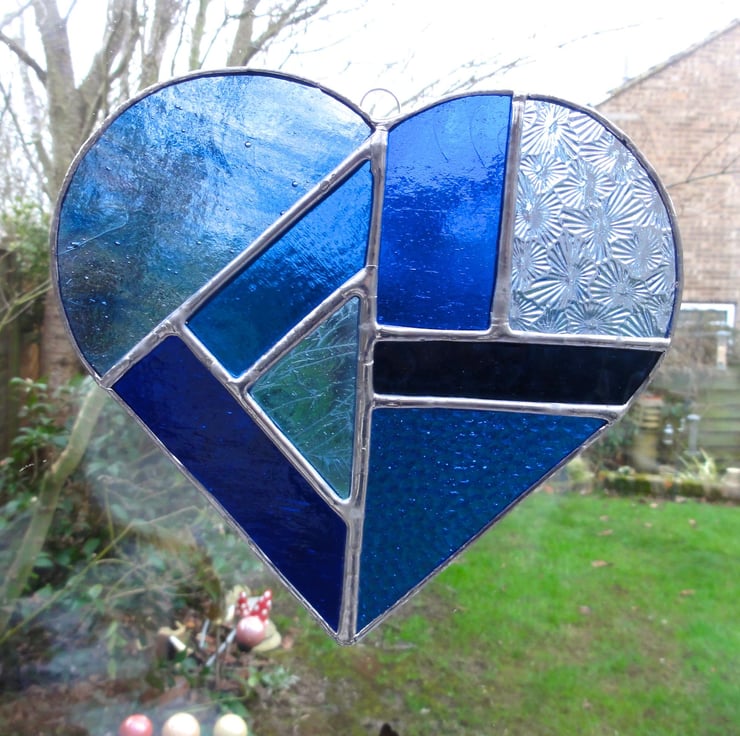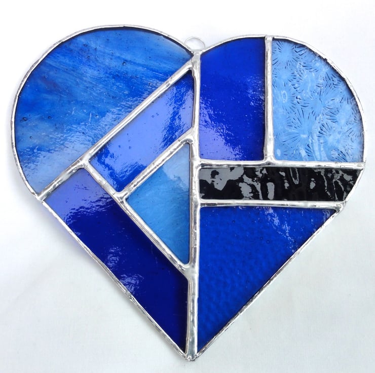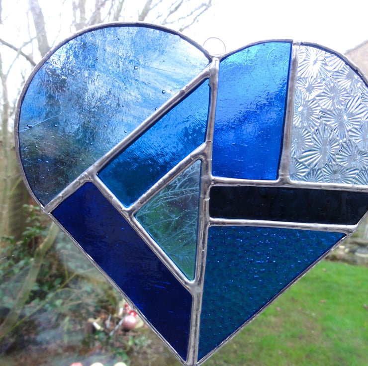 The glass used for this heart is a selection streaky, cathedral, wissmach, corella, restoration and other textured glass,. Each piece has been foiled and then soldered with a generous beading on the joints for added strength, I have left the solder silver. A ring has been attached for hanging purposes.