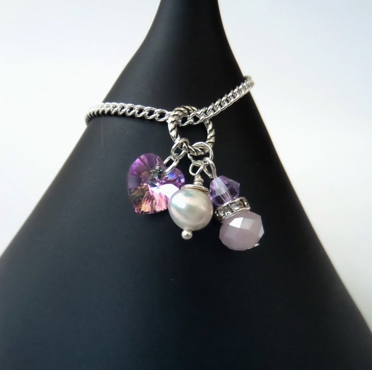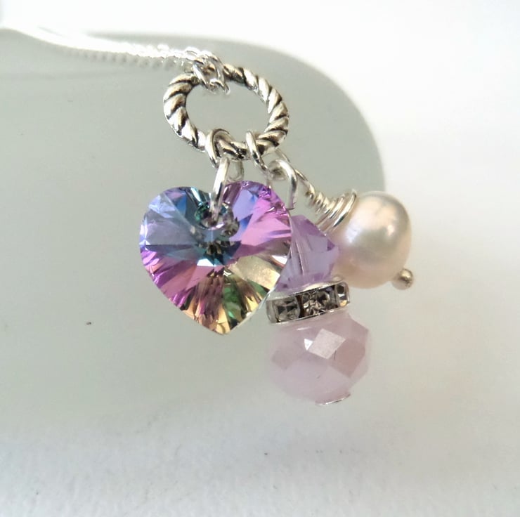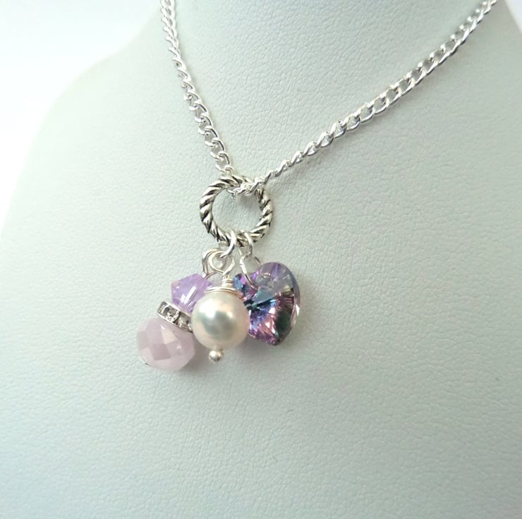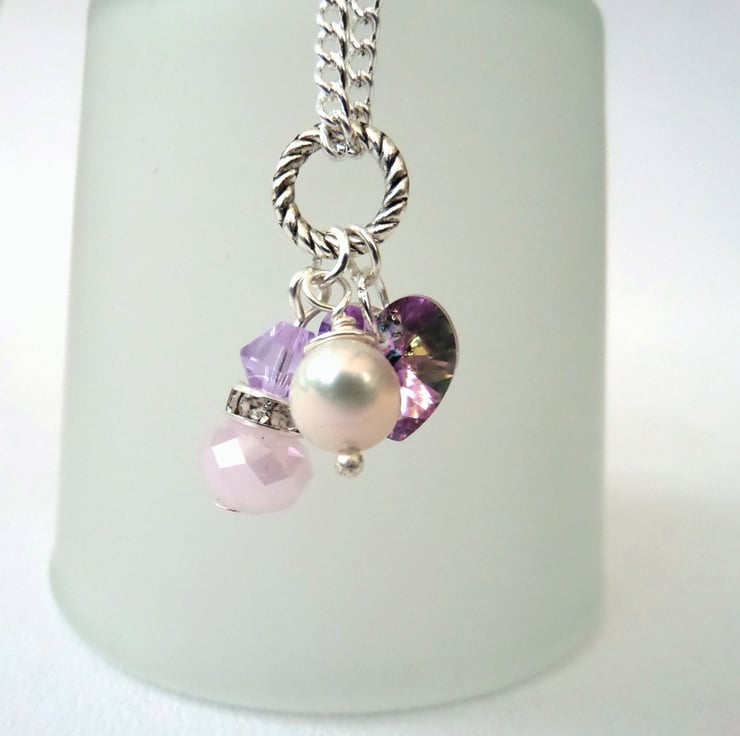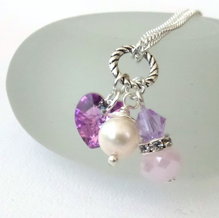A delicate cluster necklace, with a stunning Swarovski crystal heart, pink & lilac crystals and a single pearl.