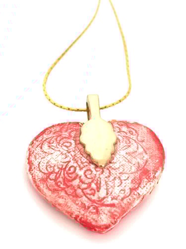 The porcelain heart measures 2.5x2.5cm. It has been attached by a leaf bail to a gold chain 17 inches in length.