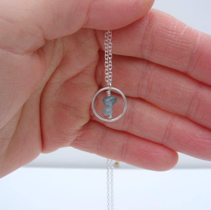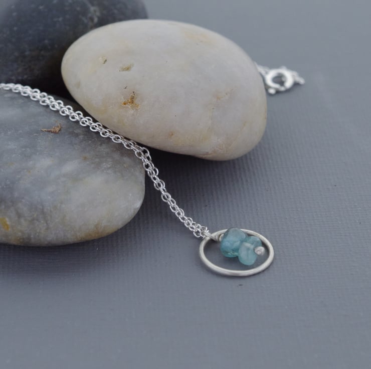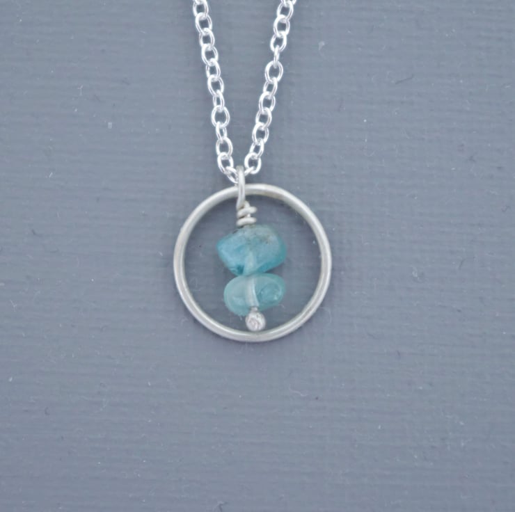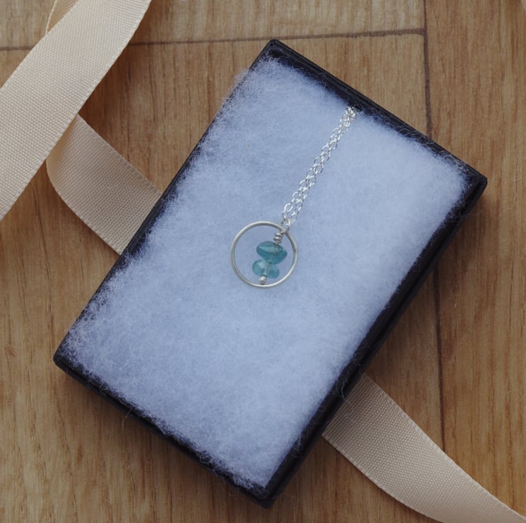 This is the elegant counterpart to my sterling silver hoop style earrings. Both are designed with simplicity in mind. The hoop is a perfect circle with two irregular apatite crystals suspended inside. This pendant has been handmade by me using sterling silver wire, to which I have given a soft satin finish. Apatite is a semi-precious gemstone which comes in translucent blues and greens and has a smooth, glassy sheen. The pendant is a very wearable size, at just 18 mm or 3/4" and is mounted on a 400 mm or 15 3/4" sterling silver trace chain.