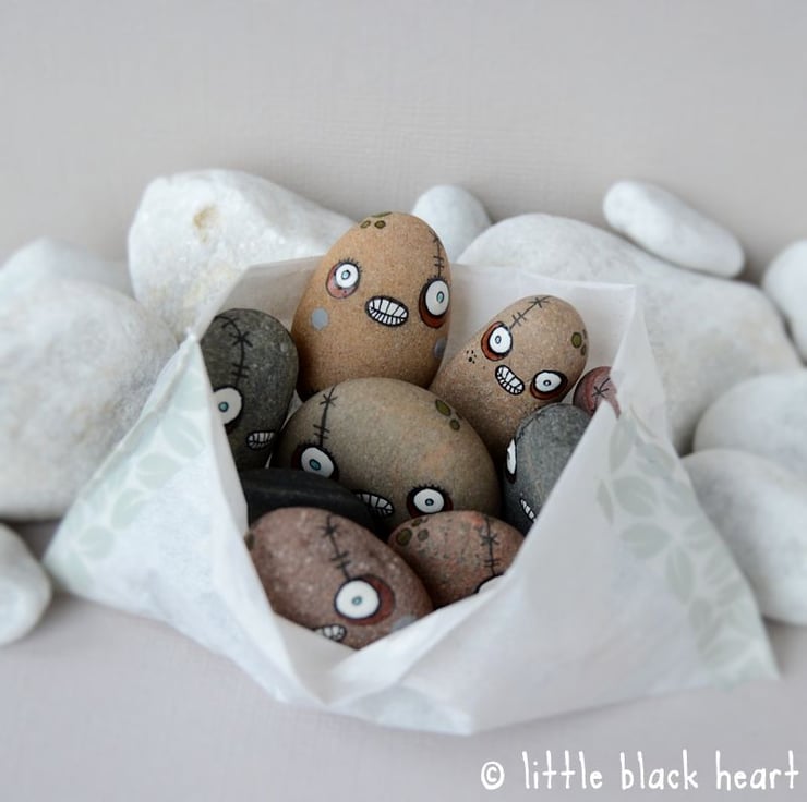 this original little collectable artwork is handpainted by myself. it is not varnished or sealed as i did not want to change the original colour and feel of the pebble, so please take care not to handle too much, or those delicate little features might rub off.