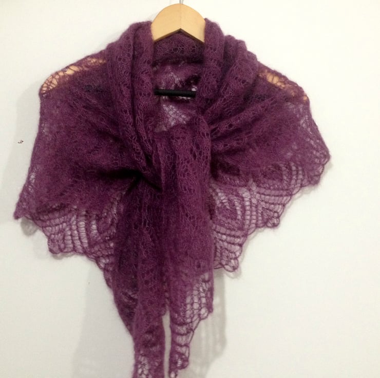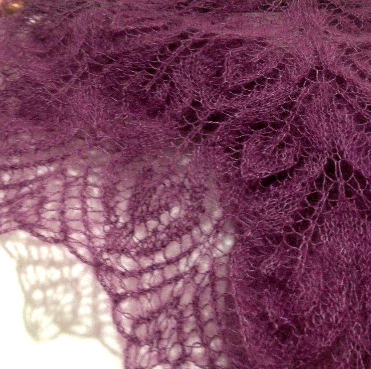 Dark purple shawl featuring a lace leaf pattern. Can be dressed up or dressed down.