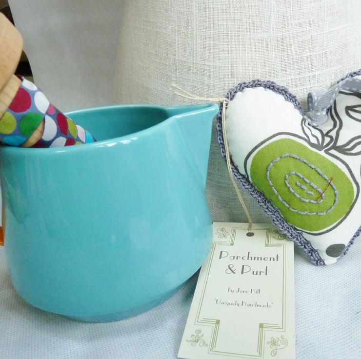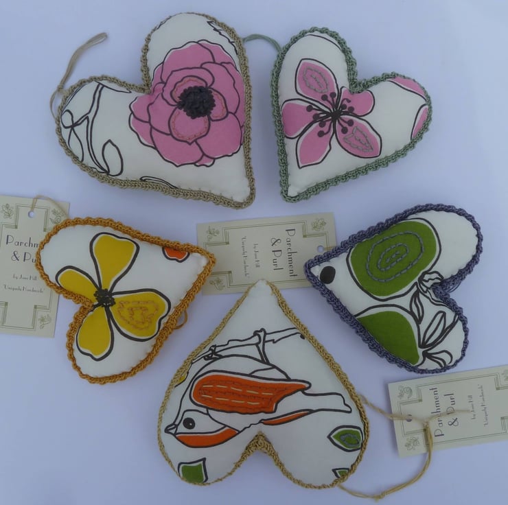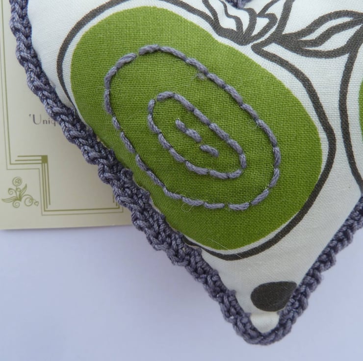 Embroidered embellishment on the front of the heart and edged in crochet.