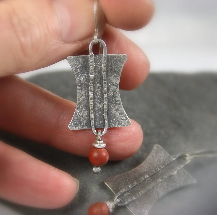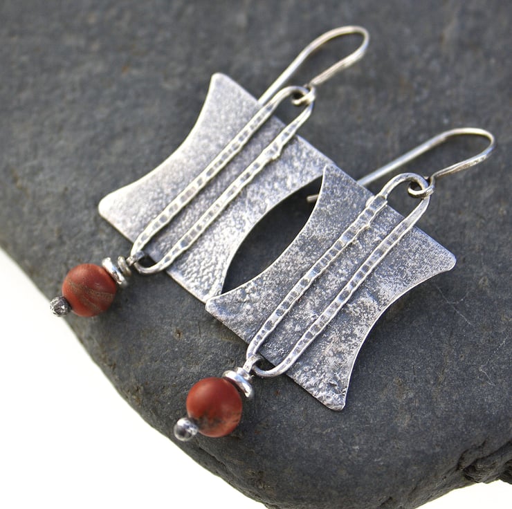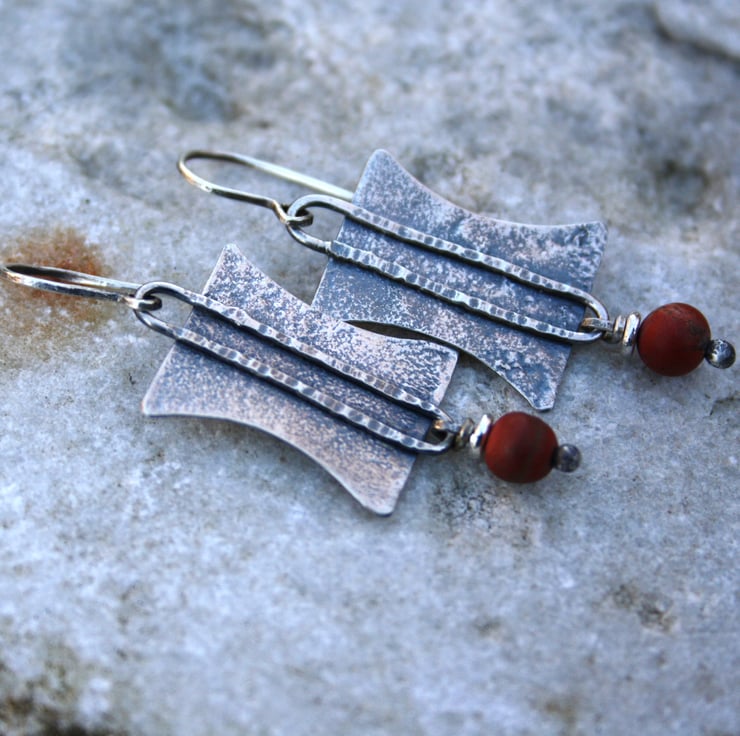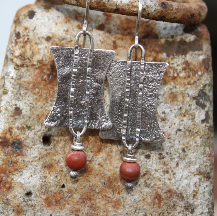 These earrings have been made from heat textured silver , they have been oxidised black and rubbed back for bright highlights. I have added a satin finished mookaite bead in shades of terra cotta, and hung them from handmade hooks.