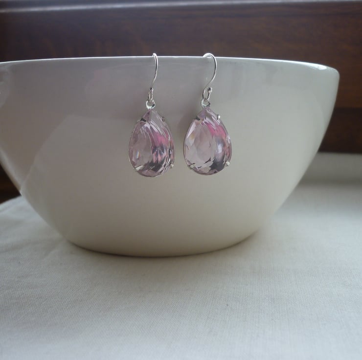 THE EARRINGS HAVE BEEN MADE WITH 18 X 13MM PEAR TEARDROP SHAPED GLASS RHINESTONE IN SHEER PINK AND SET IN A SILVER PLATED CLAW SETTING AND FINISHED WITH STERLING SILVER EAR WIRES.