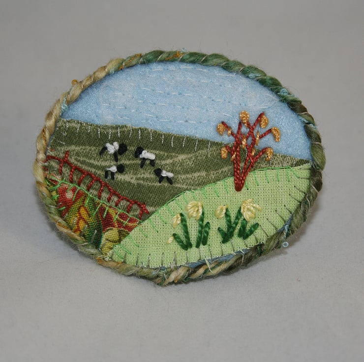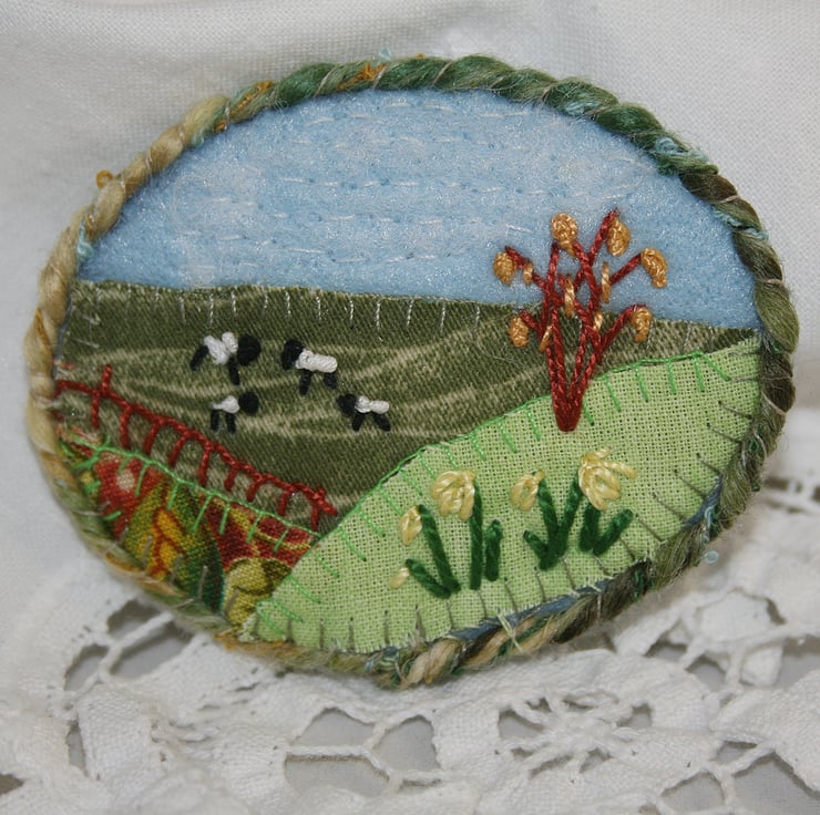 The background of this brooch has been created by appliqueing an assortment of fabric scraps to a fleece fabric background. The fabrics have been arranged to compose a patchwork of fields. Details of the composition have been added by hand embroidery. The sheep are stitched in vintage linen floss.