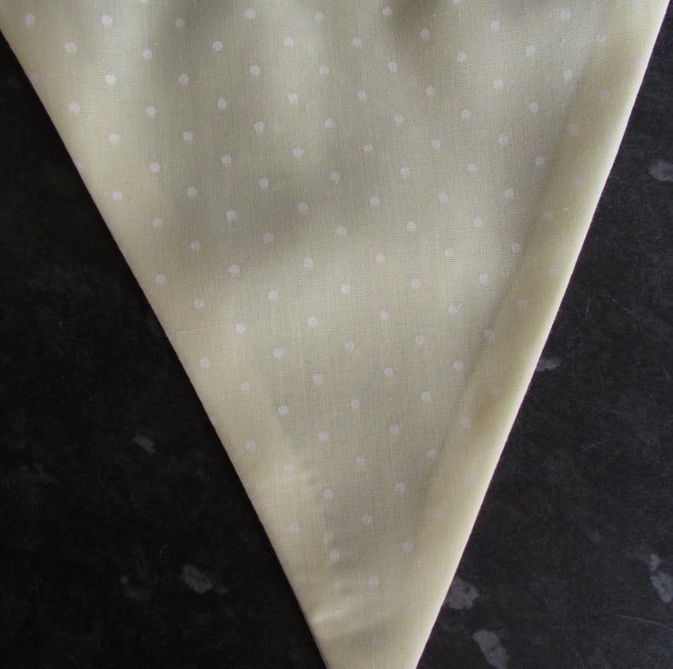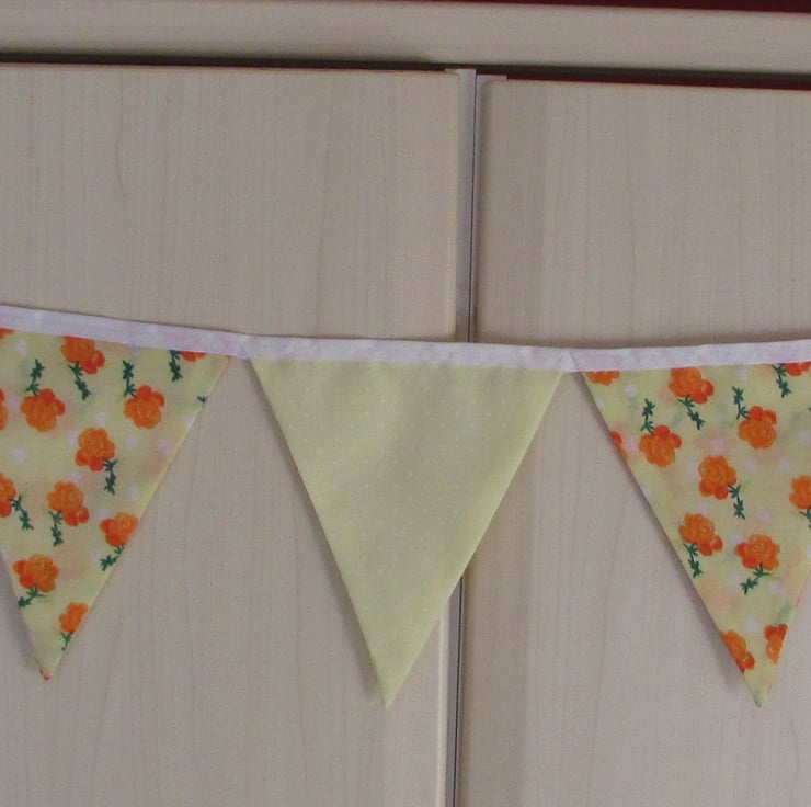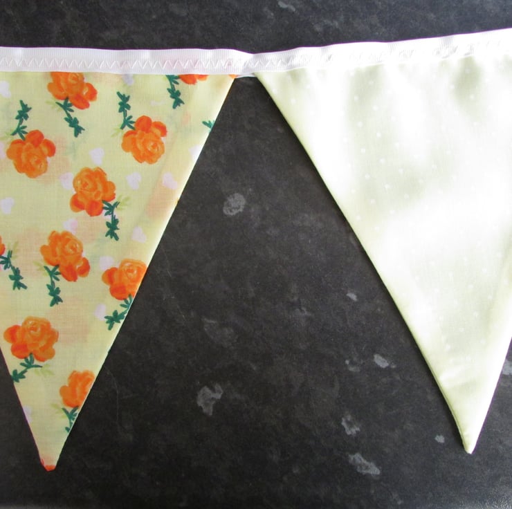 Pretty bunting to brighten up your home. This is made from delightful fabric in lovely spring colours. The bunting comprises 9 flags. There are 4 flags in a lemon yellow fabric with a print pattern of beautiful orange roses and little white hearts. The other 5 flags are also lemon yellow with a print pattern of little white polka dots. The two fabrics compliment each other perfectly. The flags are displayed on white grosgrain ribbon. The bunting is double-sided with the pattern on the front and back.