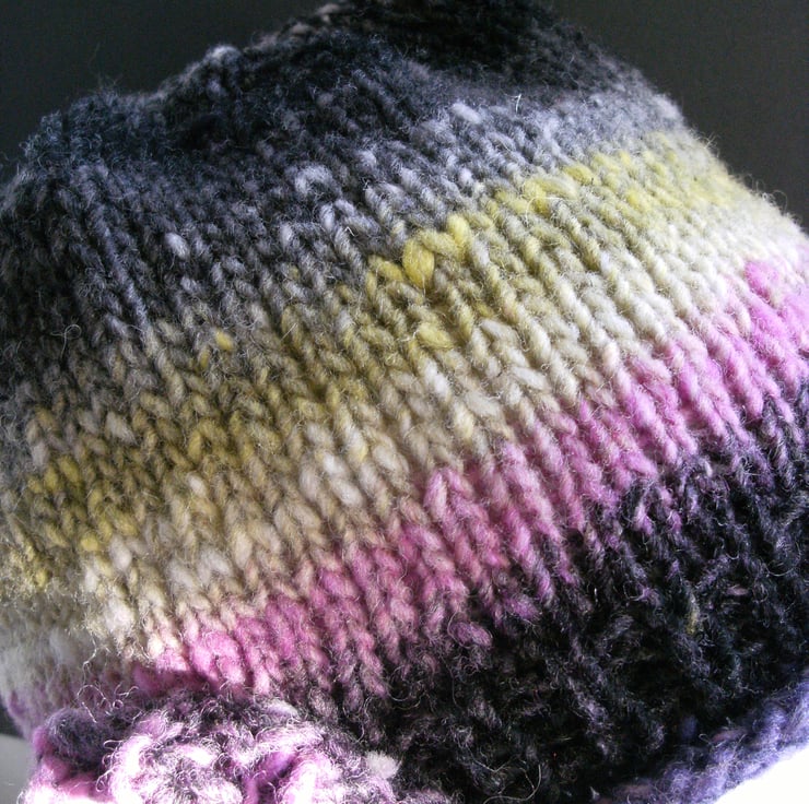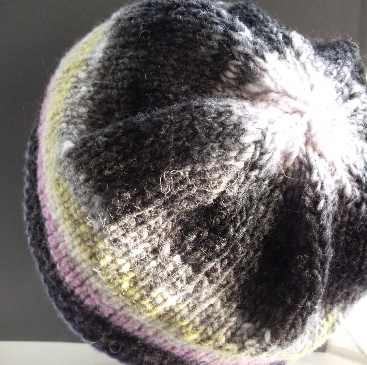 Warm, comfy and completely individual. This roll up beanie incorporates a band of rib to keep the hat in place. A style flattering to most faces as it's not too tight around the head. This wonderful self striping yarn from Noro is 100% wool and guarantees no two hats the same!