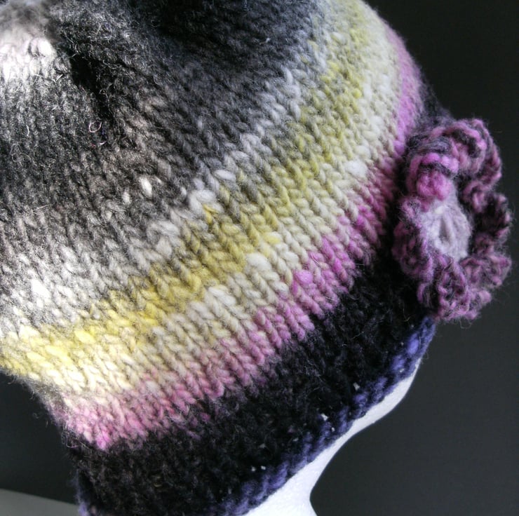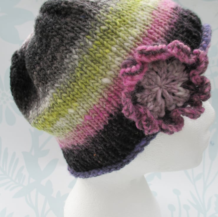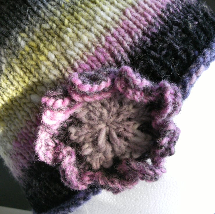 There is a big complimenting knitted flower at the lower edge of this beanie finishing it off with a pretty, feminine touch.